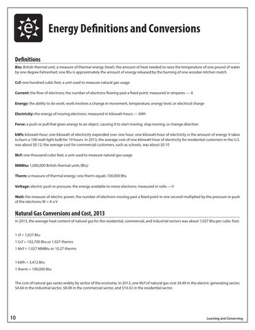 Definitions Btu: British thermal unit; a measure of thermal energy (heat); the amount of heat needed to raise the temperature of one pound of water by one degree Fahrenheit; one Btu is approximately the amount of energy released by the burning of one wooden kitchen match Ccf: one hundred cubic feet; a unit used to measure natural gas usage Current: the flow of electrons; the number of electrons flowing past a fixed point; measured in amperes — A Energy: the ability to do work; work involves a change in movement, temperature, energy level, or electrical charge Electricity: the energy of moving electrons; measured in kilowatt-hours — kWh Force: a push or pull that gives energy to an object, causing it to start moving, stop moving, or change direction kWh: kilowatt-hour; one kilowatt of electricity expended over one hour; one kilowatt-hour of electricity is the amount of energy it takes to burn a 100-watt light bulb for 10 hours. In 2013, the average cost of one kilowatt-hour of electricity for residential customers in the U.S. was about $0.12; the average cost for commercial customers, such as schools, was about $0.10 Mcf: one thousand cubic feet; a unit used to measure natural gas usage MMBtu: 1,000,000 British thermal units (Btu) Therm: a measure of thermal energy; one therm equals 100,000 Btu Voltage: electric push or pressure; the energy available to move electrons; measured in volts —V Watt: the measure of electric power; the number of electrons moving past a fixed point in one second multiplied by the pressure or push of the electrons; W = A x V