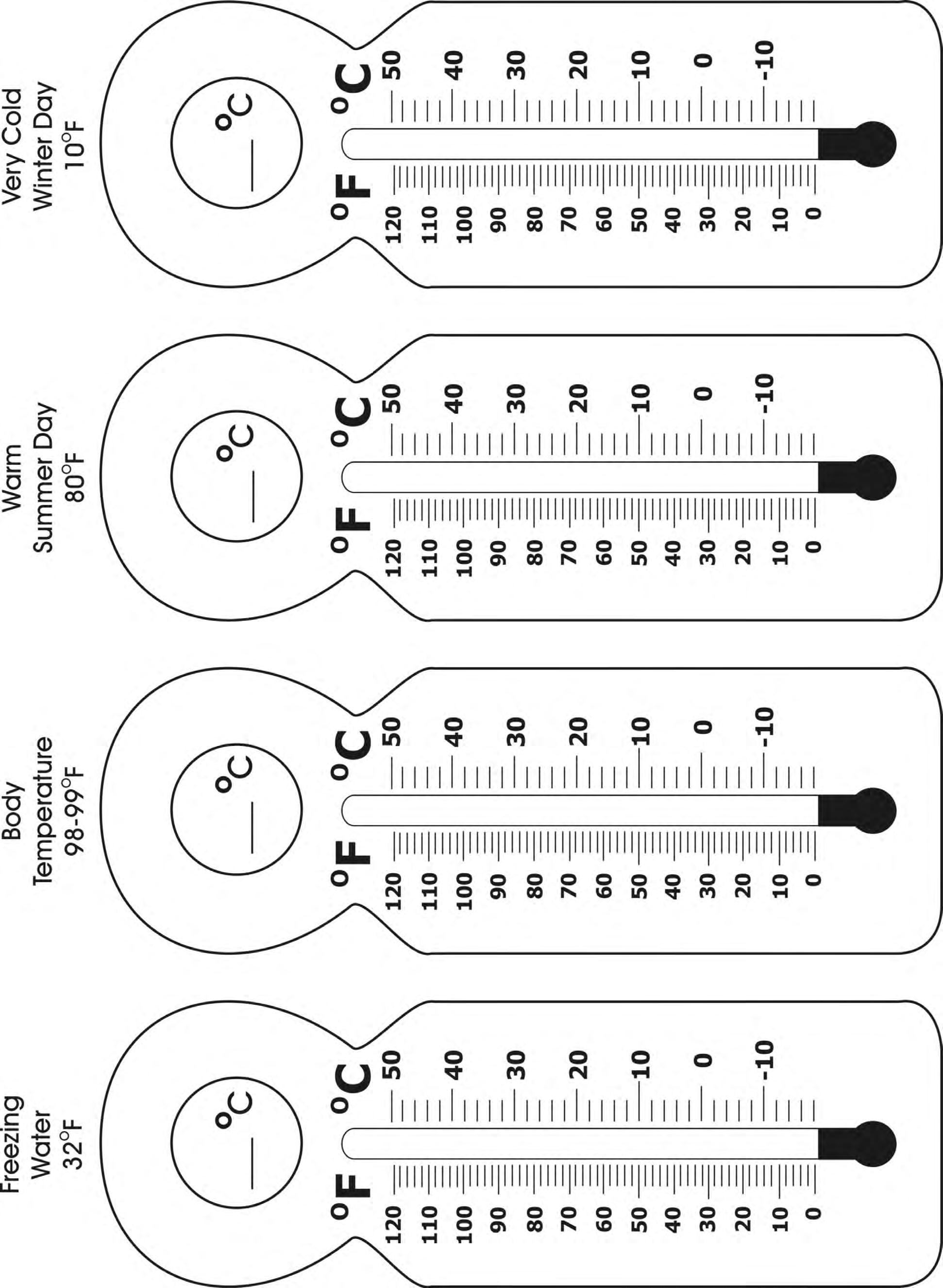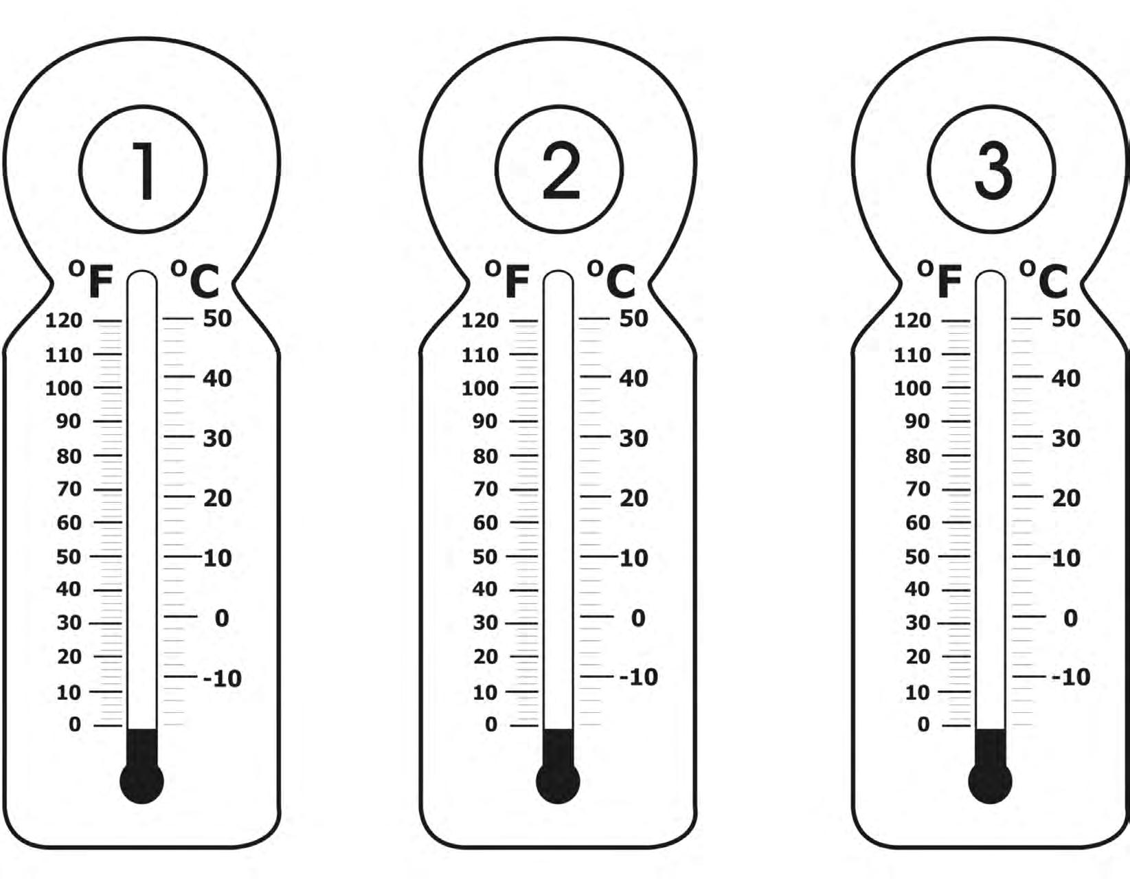 5. Color the tubes of the thermometers to show the temperatures.