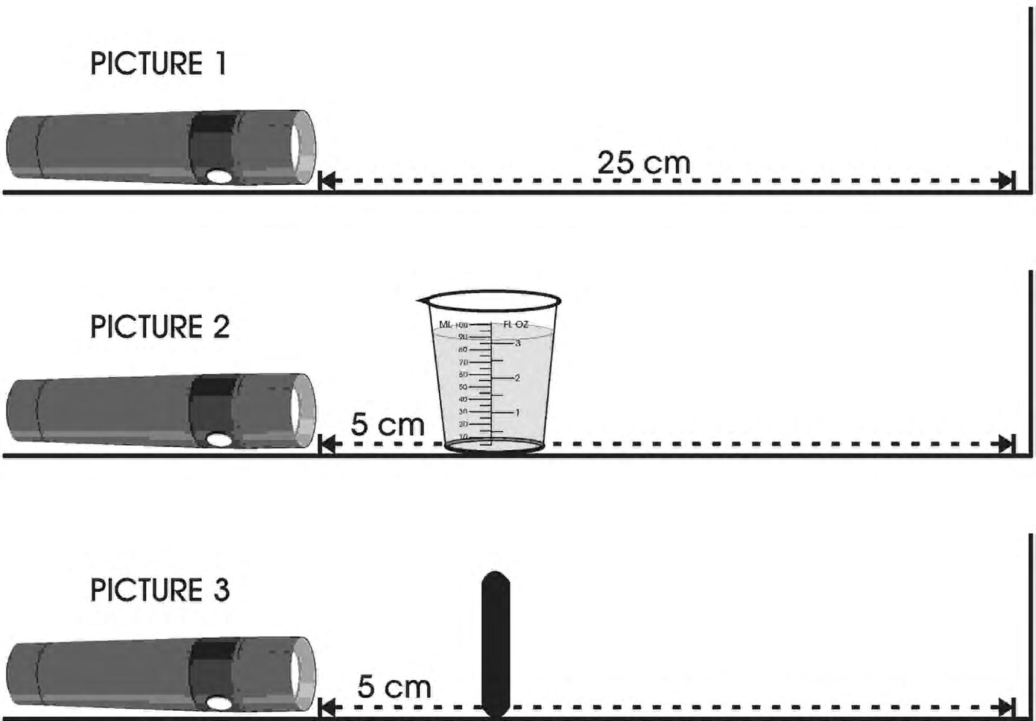 2. Place a 100 mL beaker filled with water between the flashlight and the wall, about 5 cm from the flashlight, as shown in Picture 2. Observe the light as it shines through the water onto the wall. Does the light look different when it passes through the water? Describe the light in the space below next to Picture 2.