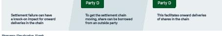 As can be seen in Figure 1, a failure ‘circle’ arises whereby Party A cannot deliver to Party B, who then cannot deliver to Party C, who needs those shares to deliver to Party A. When this happens, one of the impacted parties will borrow the shares from a separate party D to get the settlement chain moving again.