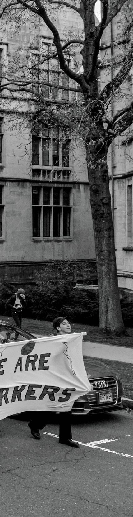 Two pieces look at the hid den costs of making Yale a place for students. Our cover story, by Abbey Kim, follows the graduate student workers whose experience of Yale as a work place have long been invalidated by Yale’s failure to recognize their union, Local 33— but that may change soon. Saachi Grewal tunnels through the dark underbelly of Yale’s power plants, surfacing with the realization that the comforts of campus we don’t really think about—heating, elec tricity—have come at an indefensi ble cost to not only the planet, but also its power plants’ employees.