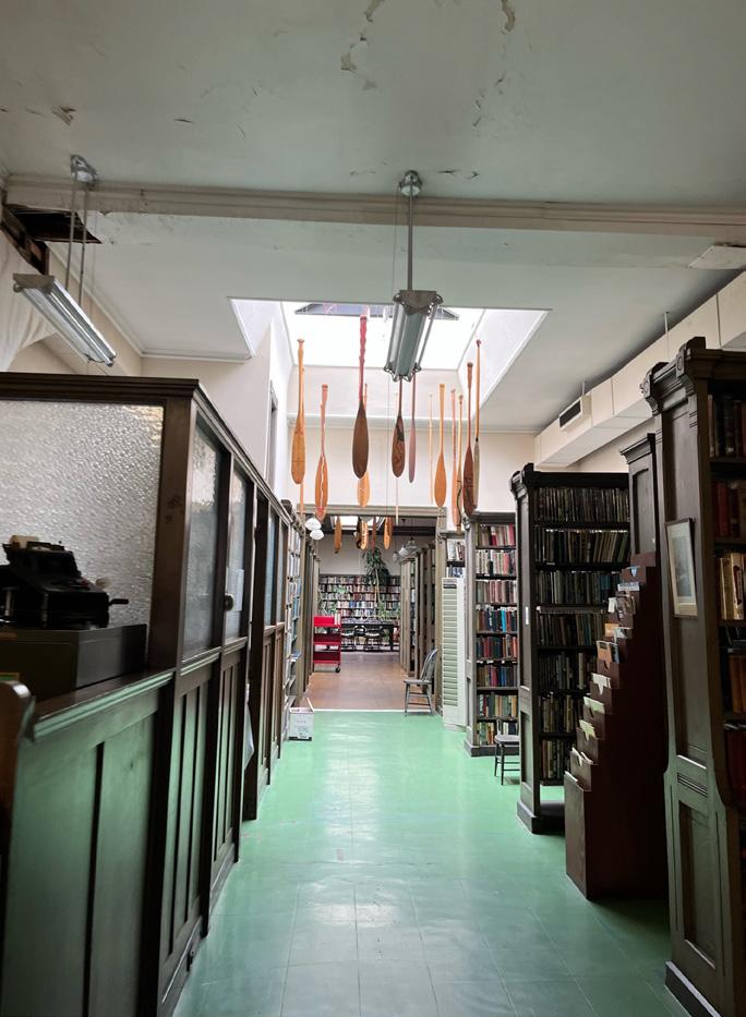 Passing through the library’s wooden doors, it’s hard not to share Marlowe’s fascination. Near the entrance sits a globe so old that Thailand is labeled “Siam.” Propped up on one of the shelves is a series of mounted insects, each painstakingly labeled behind a glass frame: a black swallowtail—Papilio polyxenes —or the green-clouded butterfly, Papilio troilus. Canoe paddles, hand-painted, hang from the ceiling. There are ancientlooking busts wearing surgical masks, an impressive vinyl collection, and posters boasting the subjects of some of the library’s most iconic evening workshops: Taxidermy, Theories in Time Travel, Ultimate Origami.