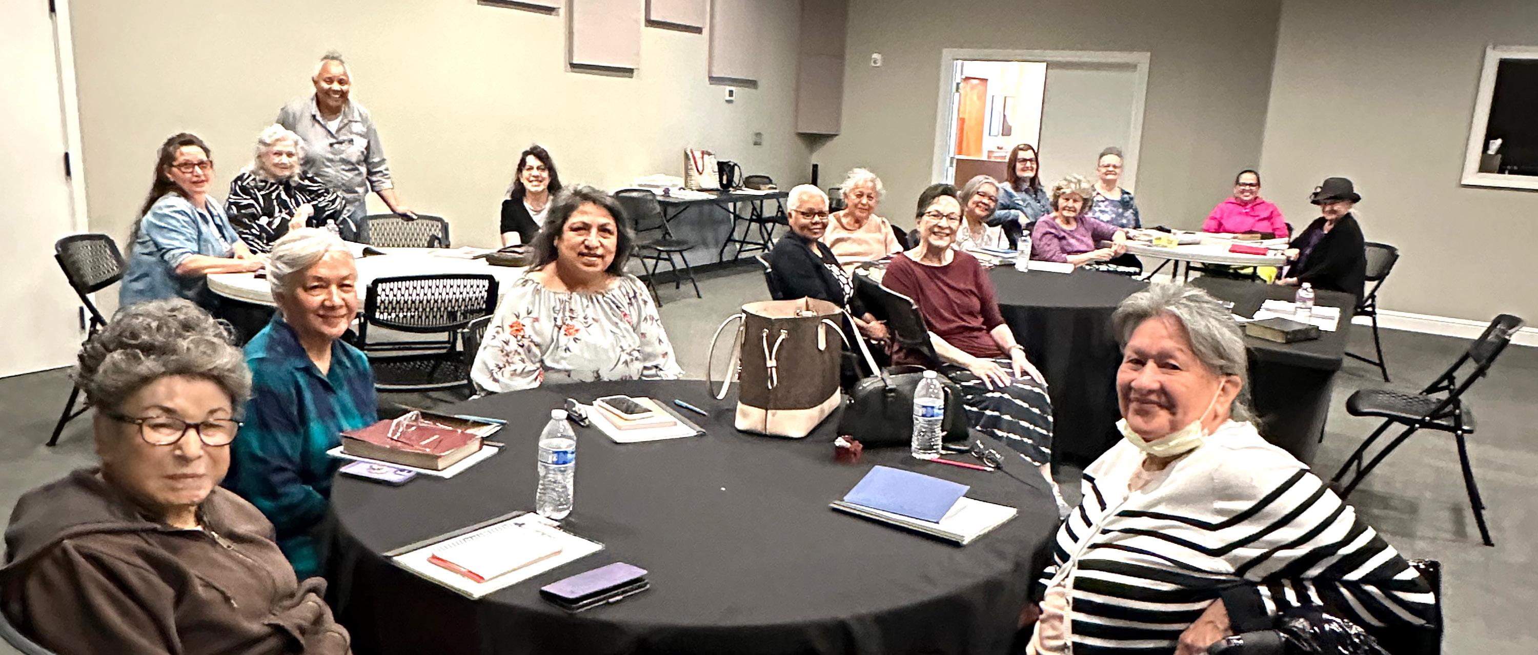 Leo and Virginia Aguilera's Bible study and fellowship life group meets at their home on the last Thursday of each month. Here the group is feasting on Sister Gloria Sadeddeen's delicious Middle Eastern dishes, complete with pita bread and an assortment of baklava for dessert to complement her chicken and rice delicacy. The group later "feasted" on the Word taught by Brother Leo Aguilera.