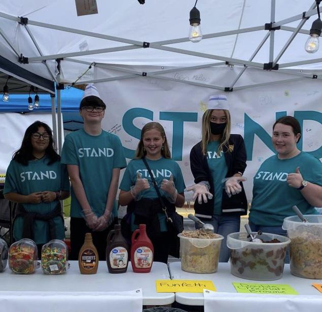 1.) Serving up edible cookie dough and positivity at the STAND booth, NHS students freshman Estrella Negrete-Sanchez, freshman Gehrig Watkins, freshman Emma Zimmerman, senior Hallie Watkins and senior Savannah Hunsucker pose for the camera. Photo Courtesy. 2.) While working their shift at the NHS cheer bake sale booth junior Alicia Gaeddert, sophomore Daytona Doty-Helm and sophomore Violet Bartley make funny faces at the photographer. Photo by Caleb Smith.