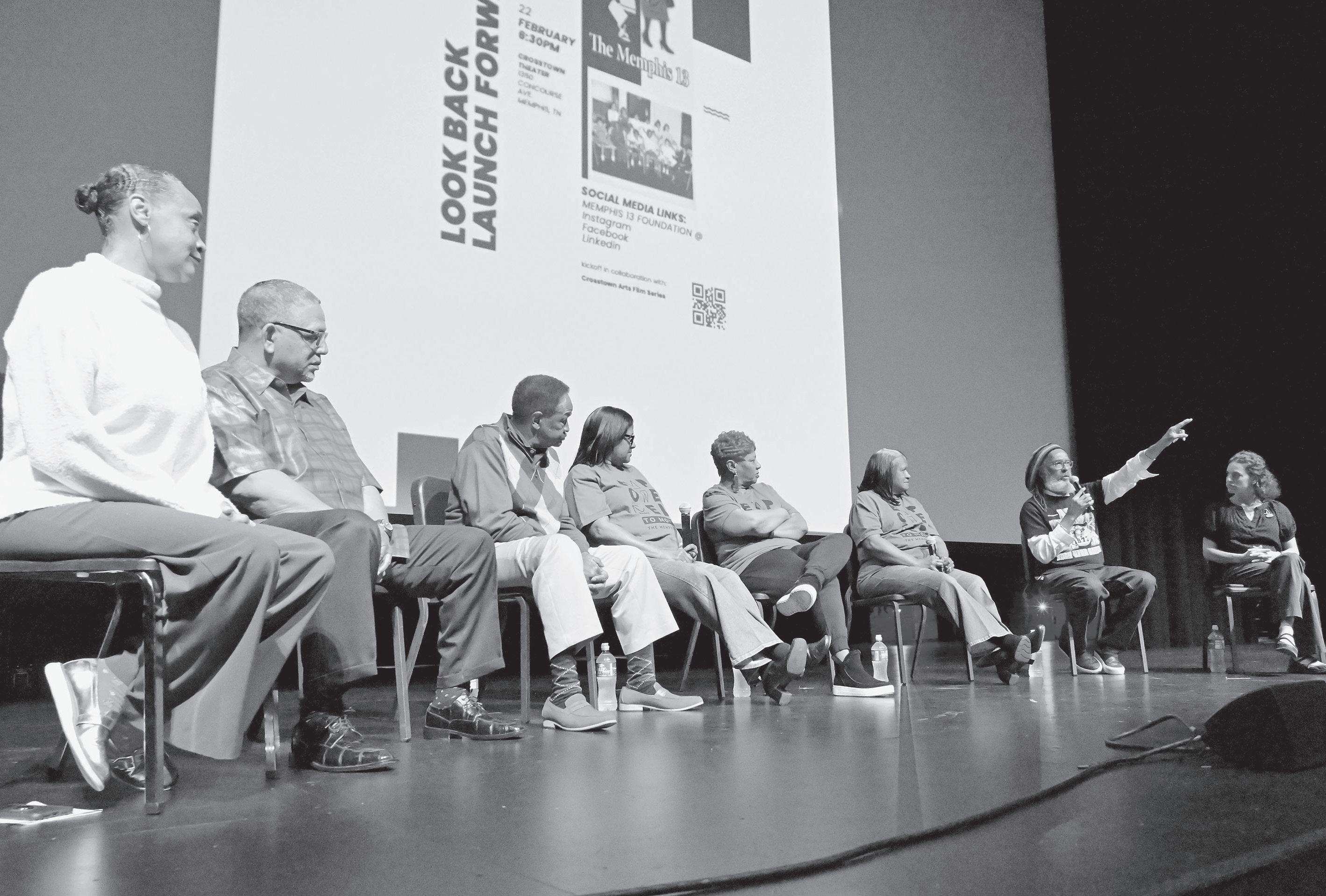 a panel discussion with members of e Memphis 13, including Dwania Kyles, Leandrew Wiggins, Alvin Freeman, Sharon Malone, Sheila Malone Conway, Jacqueline Moore-Christion, and Menelik Fombi (formerly Michael Willis), moderated by Dory Lerner from the National Civil Rights Museum.