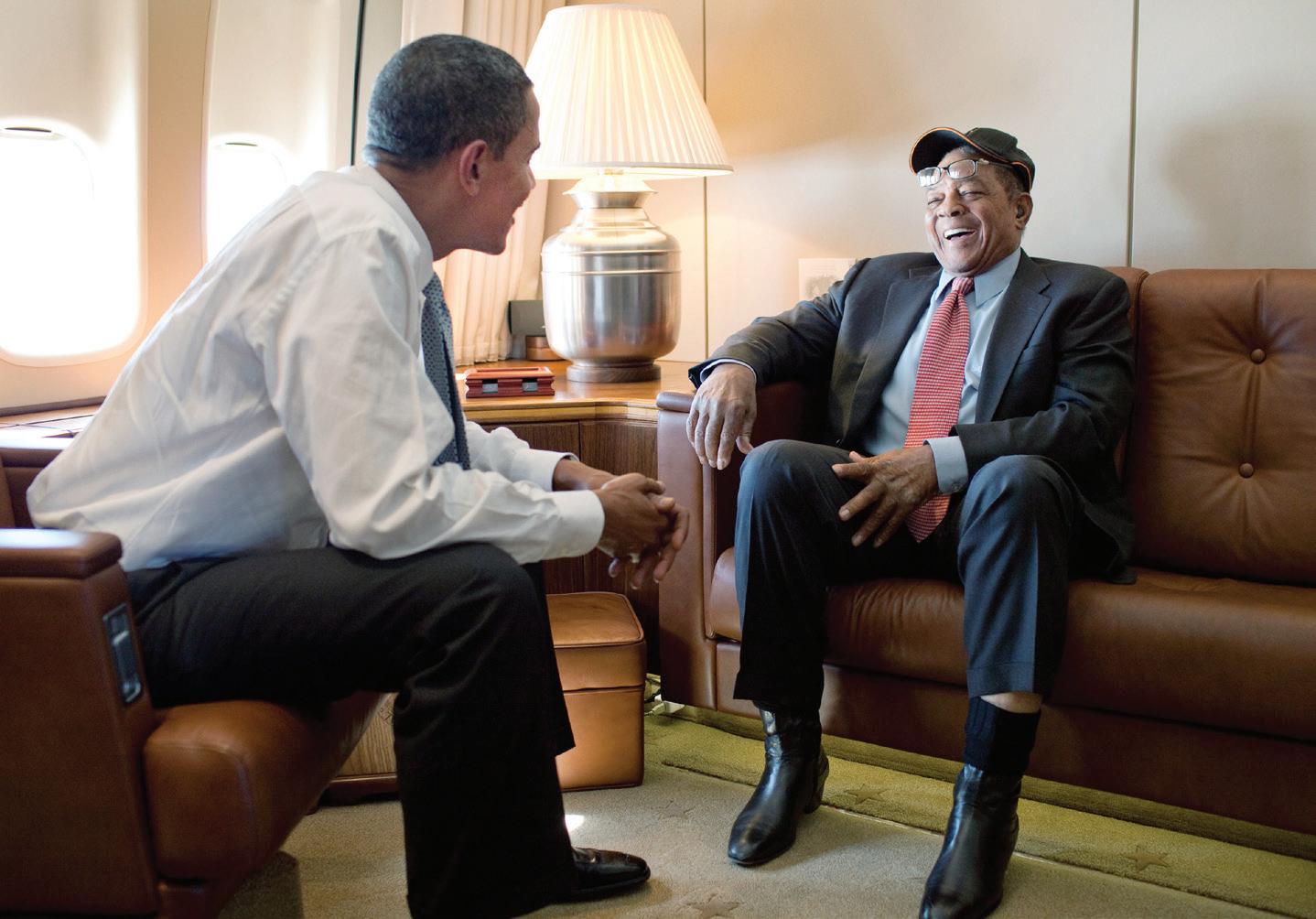 President Barack Obama talks with baseball great Willie Mays aboard Air Force One en route to the MLB All-Star Game in St. Louis, July 14, 2009. In 2015 Obama awarded Mays the Presidential Medal of Freedom. (Official White House Photo by Pete Souza)