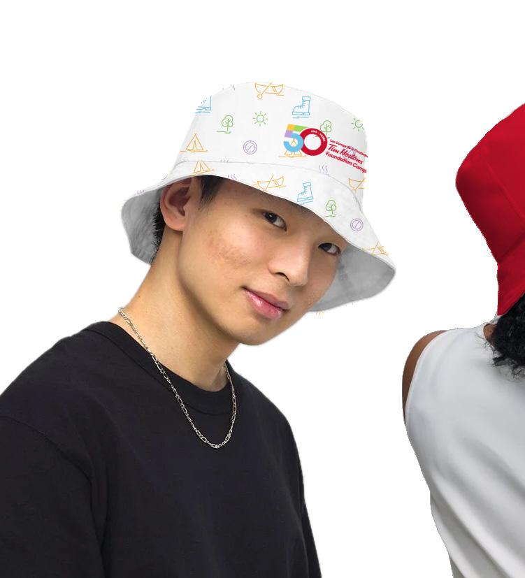Double the style, double the fun. This reversible bucket hat is ready for any adventure—flip it one way for a classic red look with the iconic Tim Hortons logo, or switch it to white for a fresh, playful vibe featuring the Tim Hortons 50 Years of Foundation Camp logo surrounded by a lively step-andrepeat pattern of colourful Camp Day icons. Lightweight, comfortable, and totally versatile, it’s the perfect hat for sunny days, outdoor fun, or showing your Tims pride in two ways at once.