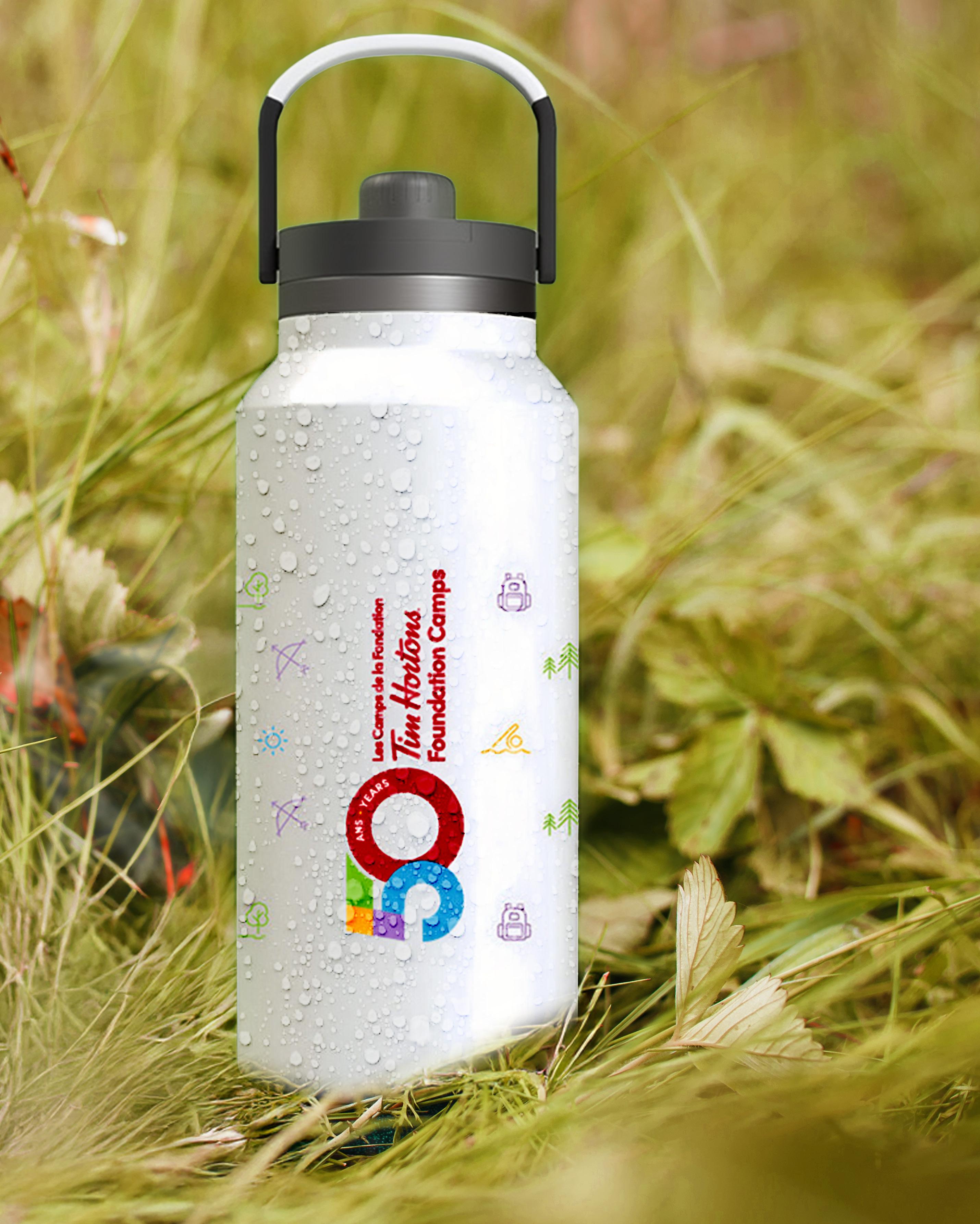Drink up, Camp Day style. This double wall vacuum insulated stainless steel bottle features a powder-coated finish, wide mouth opening, and leak-proof spout— finished with the Tim Hortons 50 Years of Foundation Camps logo and colourful icons.