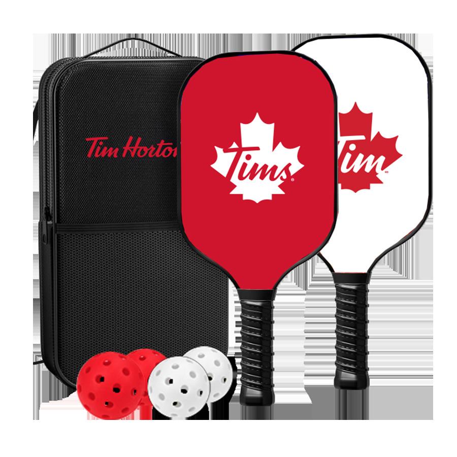 Game on. This pickleball set includes a carry bag and four balls, plus ergonomic grip paddles for comfortable, easy play—perfect for fun on the go.