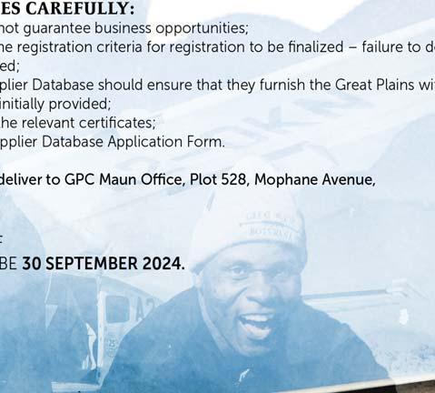 Printed and published by The Ngami Times Printing and Publishing Co (Botswana) (Pty) Ltd at their offices, Mabudutsa Ward, Maun. Tel; 6864807, Fax 6860257 E-mail: tnt@info.bw. Website: www. ngamitimes. com Printed on recycled newsprint. Member of Media Institute of Southern Africa and Press Council of Botswana.Registered at the Post Office as a newspaper. Company registered in Botswana. All material and photographs appearing previously, currently and in future are protected items of the Copyright Act. Only the editor can provide permission for reusage of such material on receipt of a written request.The public is informed of the existence of the Press Council of Botswana, which endeavours to enhance media accountability and professionalism. For this purpose, the public is urged to refer any complaints, suggestions or comments regarding issues of how the media in Botswana reports generally to the following address: The Chairperson, Press Council of Botswana, PO Box 301315, Tlokweng. Tel 3500378. Fax 3161196.