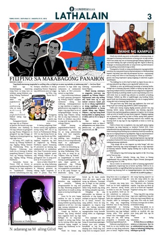 “Ang hindi marunong magmahal sa sariling wika, ay higit pa sa amoy ng mabaho at malansang isda.”— Gat Jose Rizal Bakit nga ba lumipas, idineklara ni dating porsyento sa mga lalaki ang mabisang maintindihan ng kinakailangang mayroong pangulong Ramon Magsaysay nakaunawa at nakakasulat bawat Pilipino. isang beses sa isang taon na ang selebrasyon para sa Linggo ng Ingles, at 96.8 porsyento Hindi lamang matatapos inilalaan upang kilalanin ang ng Wika. Ang naman sa mga babae. sa paggunita taon-taon ang ating Wikang Pambansa? bawat ika-13 Ang modernong kabataan paggamit ng Wikang Filipino. Itinalaga ito ay hindi gaanong gumagamit Pagyamanin natin ang sariling dahil ang ng Wikang Filipino sapagkat atin, hindi lama ng sa mga pagkakaroon natutunan nilang mas natural resources kundi pati n g mabisang makipagtalastasan na rin sa wikang nagbubuklod pambansang sa mga dayuhan at angkop sa at siyang nagbibigay sa atin wika ay isang globalisasyon ang paggamit ng ng pagkakakilanlan sa buong mabisang Ingles. Ang mga datos na ito ay mundo bilang mga Pilipino. tulay sa nangangahulugan lamang na Pilipino— ang mga taong hindi pagkakabuklodhanggang tayong mga Pilipino, lalong- lamang kilala sa angking husay buklod nating mga ika-19 ng lalo na ang mga kabataan, ay at talino, pati na rin sa sipag at Pilipino. Agosto ang hindi na inilalaan ang pokus tiyaga. May kalakip na Kung gaano karami naitakdang sa pag-aaral ng pagsasalita ng impormasyon mula sa https:// ang mga isla sa Pilipinas petsa. wikang Filipino. ay ganoon din karami ang mga Si dating pangulong Fidel Hindi lamang sa philippineone.com, https://www. dayalekto nito. Kabilang na Ramos naman ang nagdeklara pagkakabuklod-buklod ang philstar.com, at http://www. rito ang Cebuano na ginagamit noong taong 1997, ika-15 ng importansya ng wika, ito gmanetwork.com. ng mga Bisaya, Hiligaynon na Enero sa Proklamasyon Bilang rin ay isang palantandaan ginagamit ng mga Ilonggo, at 1041 na ang buong buwan ng kung saan tayo nagmula, Tagalog na siyang ginigamit ng Agosto ay ang Buwan ng Wika. pagkakakilanlan kung mga taga-Luzon. Ilang taon na rin ang sakaling tayo mangibang Sa taong 1937, napili ng nagdaan magmula ng tayo bansa, at ito ay isang kulturang Surian ng Wikang Pambansa ay nagkaroon ng Wikang dapat na pagkaingatan, ang Tagalog bilang batayan Pambansa ngunit tinatayang mahalin at palaguin. ng Pambansang Wika ng 85 porsyento pa lamang ang Lubos na isinusulong ng Pilipinas. Dalawang taon nakakaintindi at nakakabasa gobyerno ang pagpapayaman mula rito ay tinawag ni dating nito. Nasa 79 porsyento naman ng ating Pambansang Wika. pangulong Manuel L. Quezon, ang kayang magsulat gamit Ang tema sa taong ito ay Ama ng Wikang Pambansa, ang Wikang Filipino at ang “Filipino: Wika ng Saliksik,” ang Tagalog bilang Wikang gumagamit nito sa pang-araw na nanghihikayat na hindi Pambansa. araw ay 45 na porsyento. lamang sa pakikipagtalastasan Samantala, buwan ng Ayon sa Index Mundi 96.3 natin dapat gamitin at Hunyo 1940 ay itinuro sa porsyento ng ating kabuoang pagyamanin ang Wikang paaralan ang Pambansang Wika populasyon ay nakakainitindi Filipino kung hindi ay pati na bilang isa sa mga asignatura at bihasang gumamit ng rin sa pagtuturo, sa pananaliksik, na kasalukuyan namang wikang Ingles magmula sa at sa iba pang larangan ng umiiral. Labinlimang taon ang edad 15 pataas. Nasa 95.8 akademiko upang mas