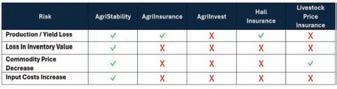 A visual representation of what AgriStability covers versus other AFSC programs. AgriStability covers production/ yield loss, loss in inventory value, commodity price decrease, input costs increase.