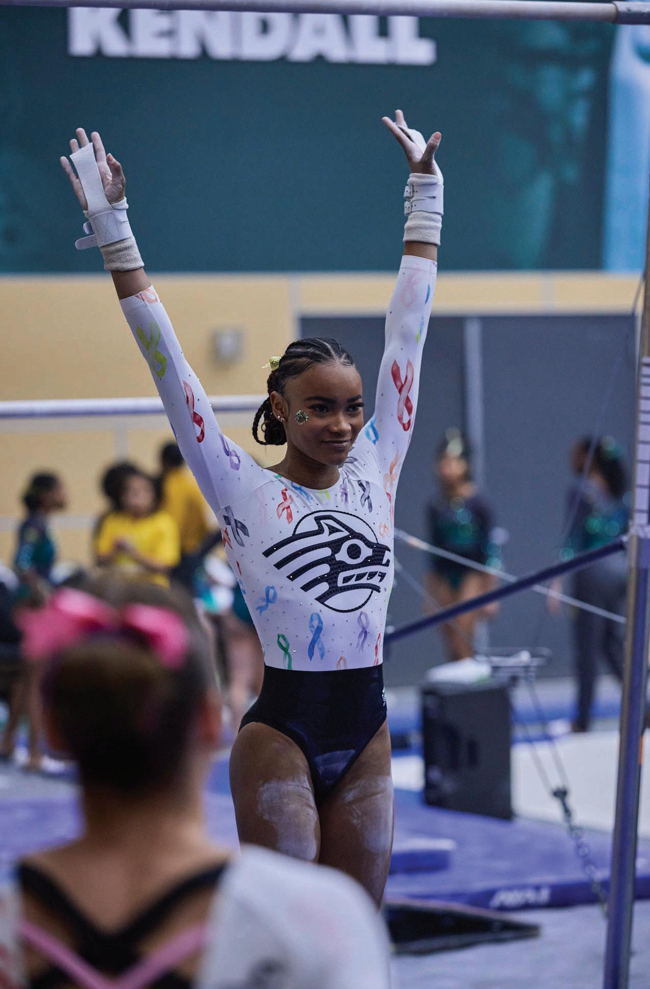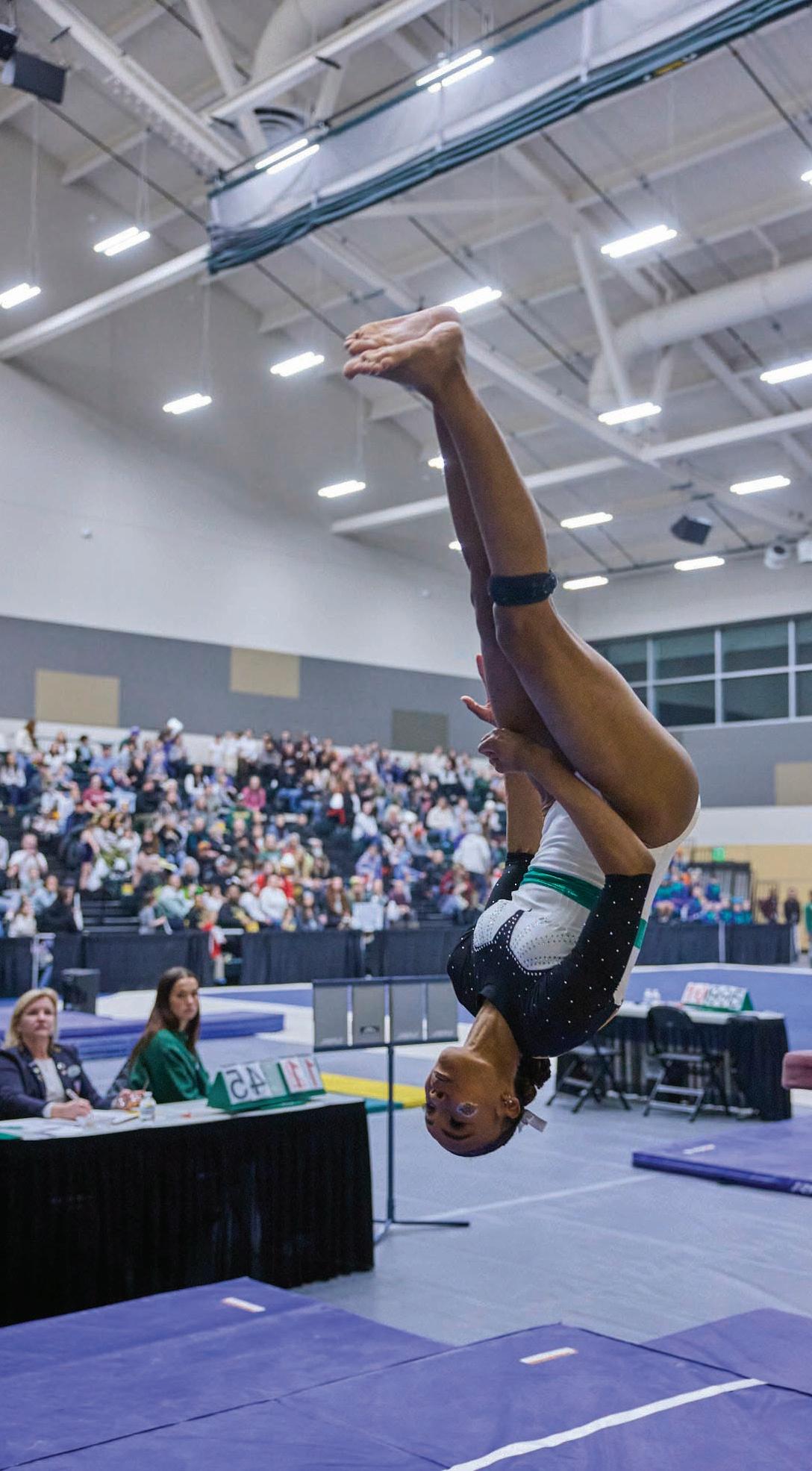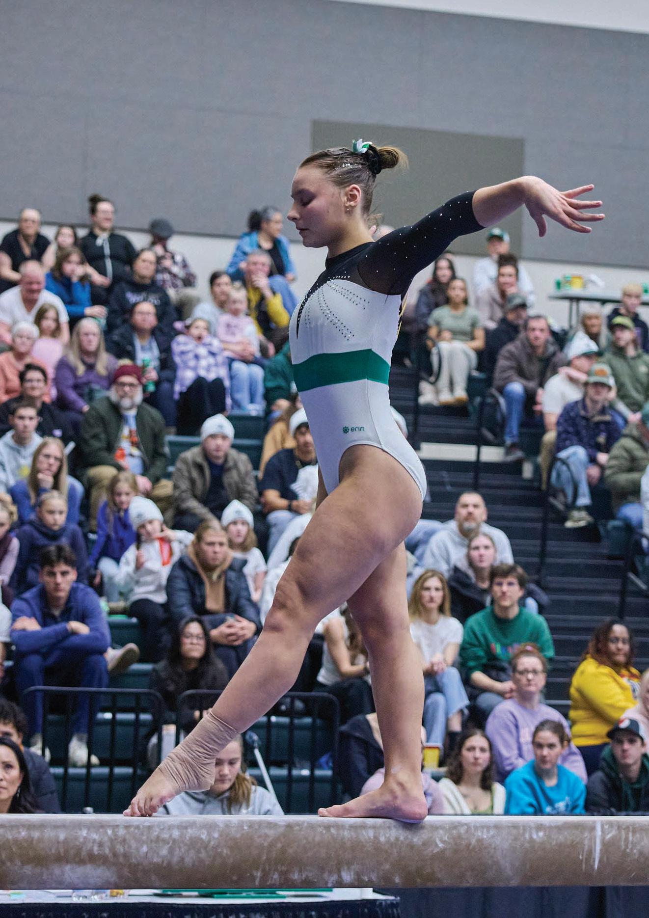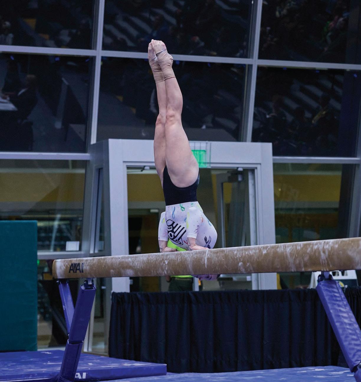 with Jamilia Duffus taking first in vault, 9.675, uneven bars, 9.775 and floor exercise, 9.675. Alexandra Karkowski took first on the balance beam, 9.750.