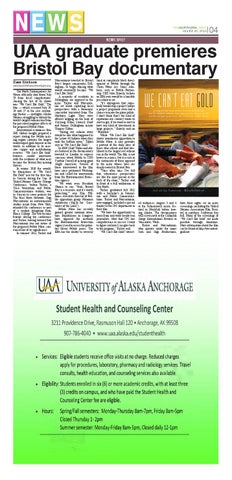 limit or completely block development at Pebble through the Clean Water Act. Some Alaskans, such as Pebble Partnership CEO John Shively, believe an EPA veto would be a horrible precedent to set. “It’s outrageous that somebody would stop a project before a project proponent even had a chance to make the plans public. I don’t think that’s the kind of reputation our country wants to start to get, if we want to start to have any kind of investment in large projects,” Shively said on “Frontline.” While “We Can’t Eat Gold” shows unanimous opposition to Pebble Mine, it also provides a portrait of the daily lives of those who subsist and find livelihood in the largest red salmon run in the world. The film is not heavy in science, but it is rich in the sentiments of those opposed to the mine whose lives are deeply rooted in Bristol Bay. “Time after time I’ve felt that subsistence perspectives are like the quiet person in the back of the room,” Tucker said in front of a full auditorium at Out North. Tucker graduated fall 2011 with a bachelor’s in Journalism and Public Communications. Tucker and Marcantonio, now engaged, included a special thanks to the JPC department in their film. “We have the opportunity to learn from and work beside real journalists. Now that JPC has catapulted me to success I want to figure out how I can give back to the program,” Tucker said. “We Can’t Eat Gold” attract-