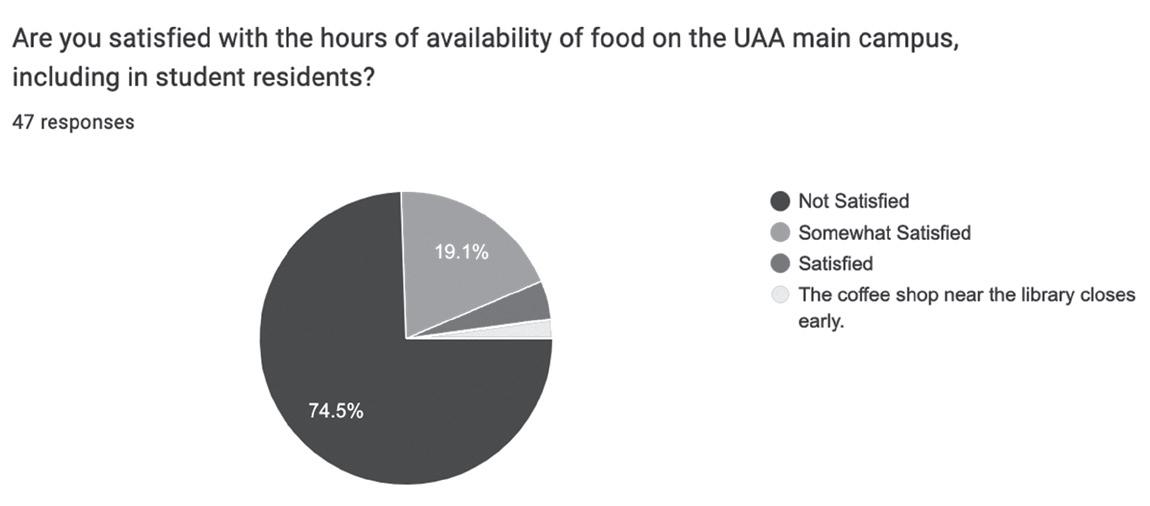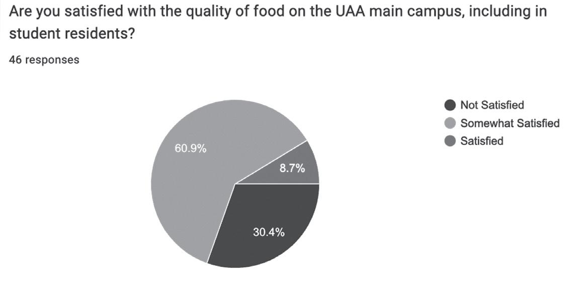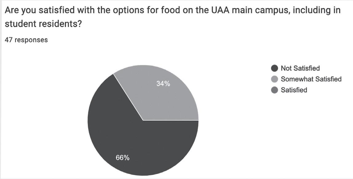 The Northern Light conducted a campus-wide food survey to see how UAA students, faculty and staff felt about food options on campus, along with any improvements they wanted to see. A majority of those polled were not satisfied with the number of options available or the hours of operation at existing locations. Many students were also in favor of a bar on campus similar to what UAF offers.