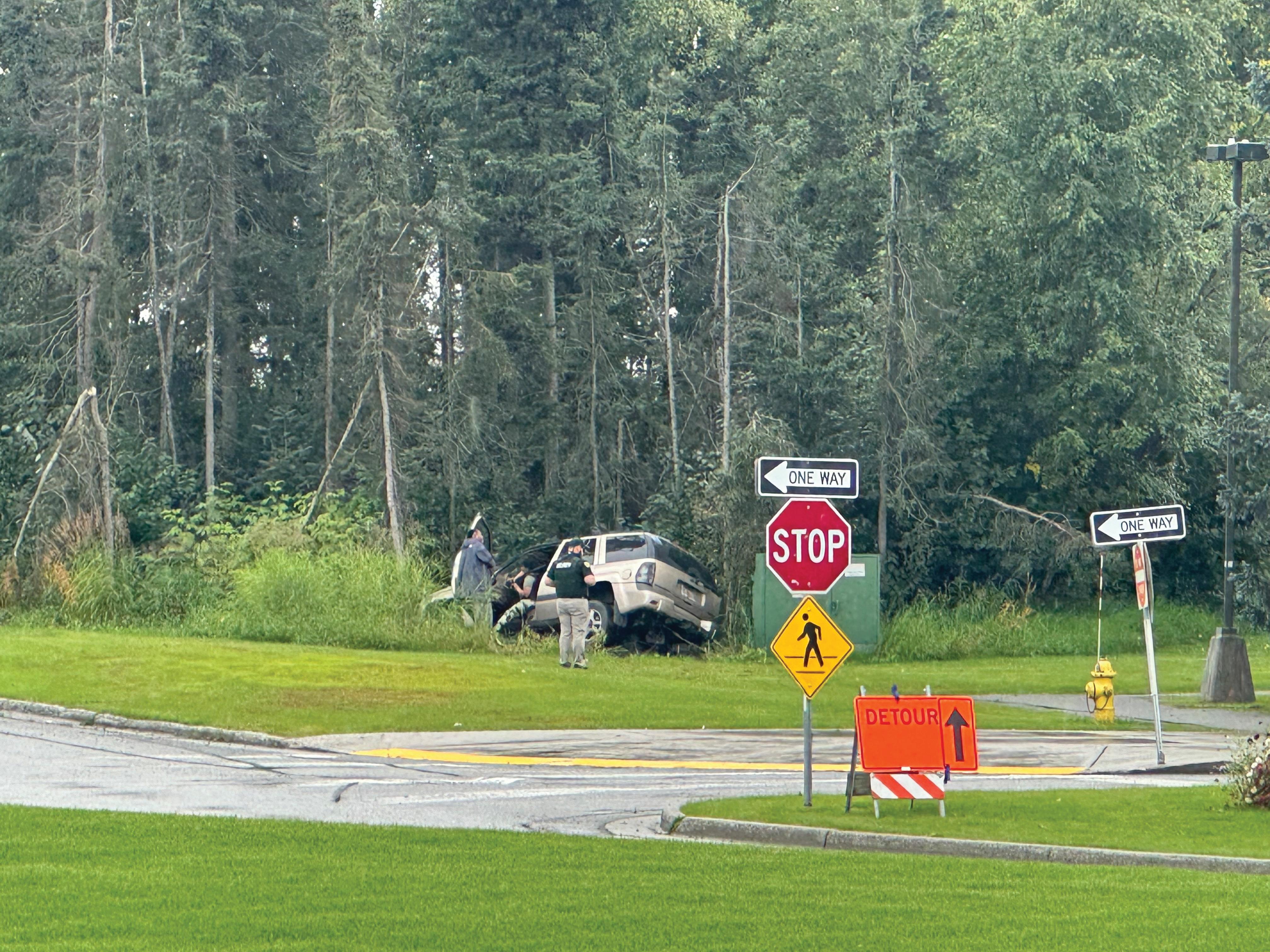 A woman driving a SUV hit two parked vehicles in the West Campus Central Parking Lot before driving off the road and into the bushes next to Seawolf Drive on Monday, Sept. 9.