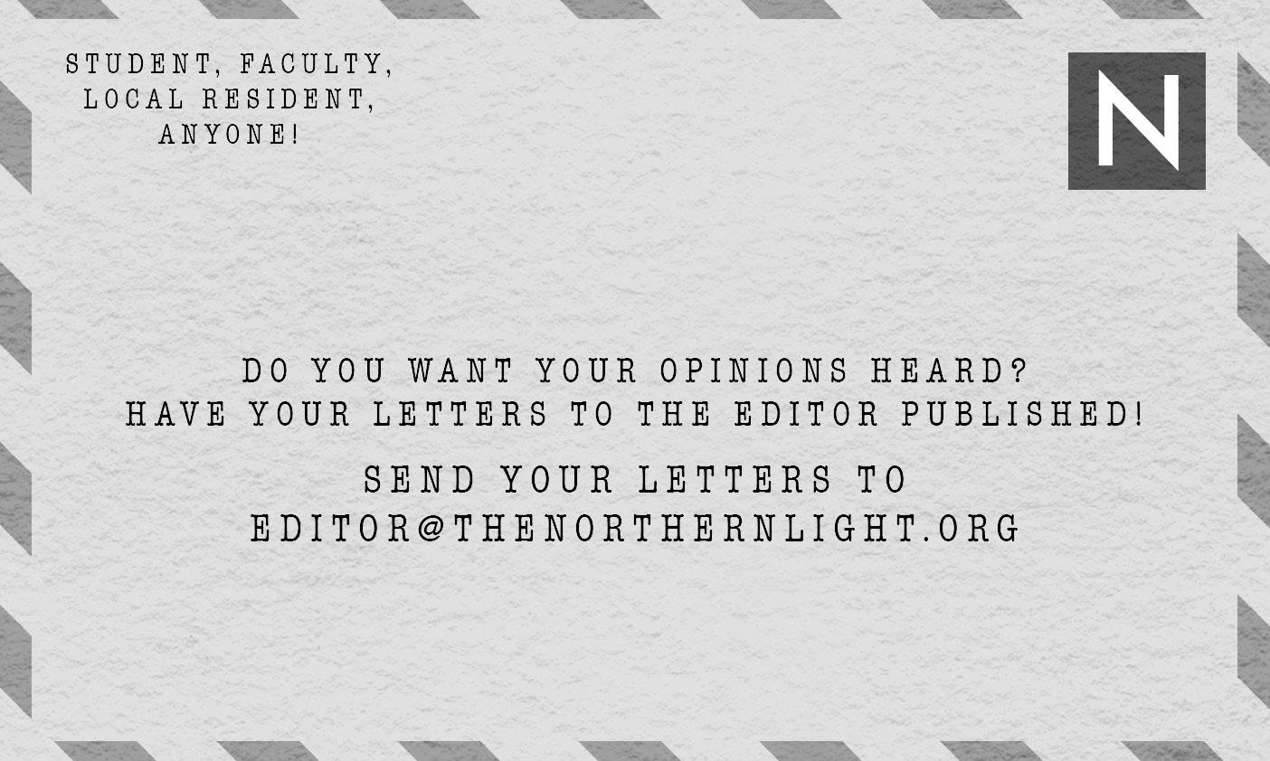 Letters to the editor can be submitted to editor@thenorthernlight.org. The maximum length for a letter to the editor is 250 words, and 150 words for letters specifically endorsing candidates for federal, local, or university office. A letter to the editor is written by someone who does not have authoritative knowledge on the subject they are discussing. Contributors are restricted to one published letter to the editor per month.