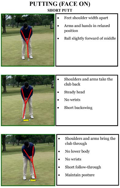 Putting is a key skill in golf that requires focus and precision To start, stand with your feet shoulder-width apart, ensuring a stable base. Keep your arms and hands relaxed, with the ball positioned slightly forward of the middle of your stance. As you prepare to putt, let your shoulders and arms guide the club back smoothly, maintaining a steady head throughout Avoid excessive wrist movement and keep your backswing short and controlled. As you bring the club through, let your shoulders and arms lead the motion, keeping your lower body still Maintain your posture and avoid any extra movement, ensuring a clean and accurate stroke Finish with a short follow-through, emphasizing control and precision in your putt.