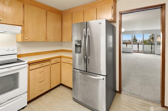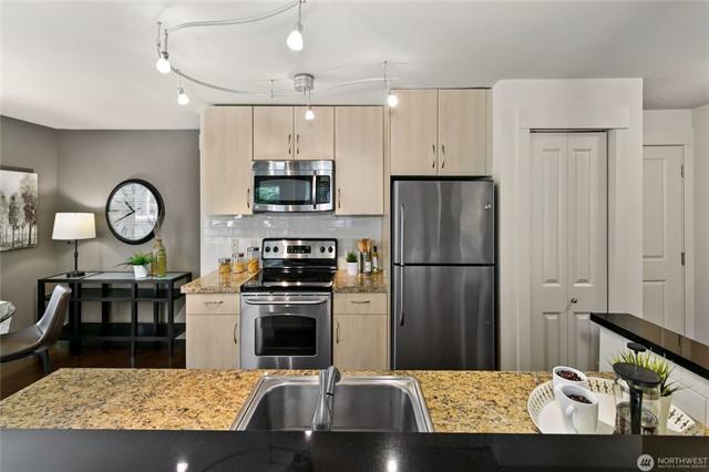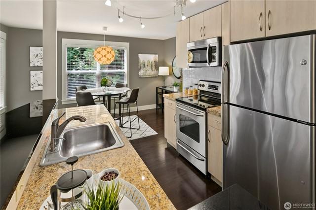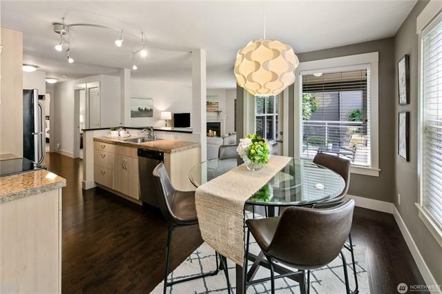 designed, expansive open concept living space with vaulted ceilings & large southern facing windows create a light & airy ambiance. The kitchen features granite countertops, plenty of storage, & stainless steel appliances. Laminate hardwood floors throughout. In unit W&D, 2 reserved parking spaces, & large, private balcony overlooking green space. Pets welcome! No rental cap, close to Swedish Hospital. Nearby light rail stations for easy commuting. Mins away from downtown Edmonds with trendy restaurants, cafes, shops, & parks.