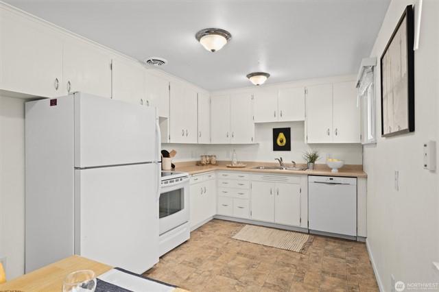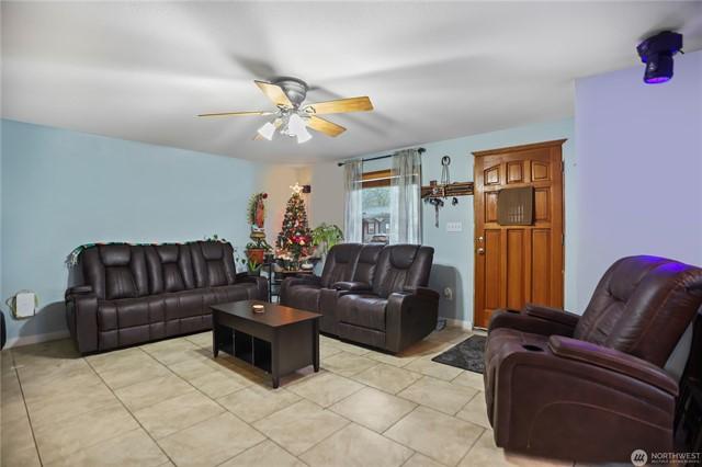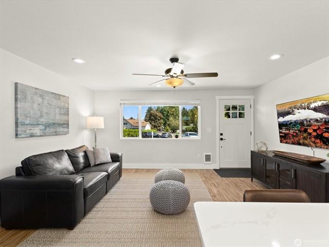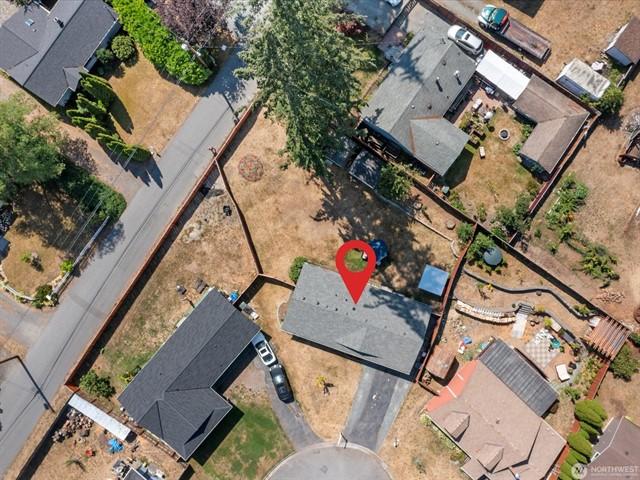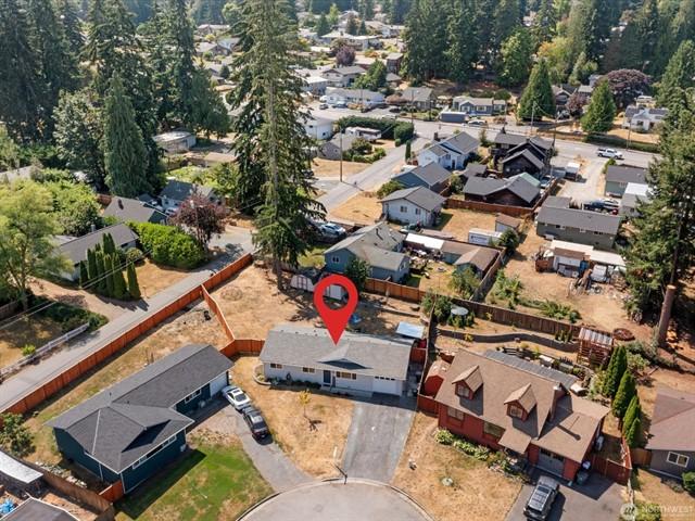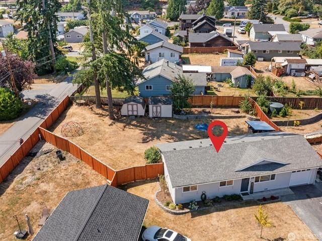 This adorable 3-bedroom rambler is nestled on a large cul-de-sac lot in a tranquil neighborhood. The bright and airy openconcept home is bathed in natural light, showcasing a remodeled kitchen with quartz countertops, stainless steel appliances, a large breakfast bar, and sleek laminate flooring. The three generously sized bedrooms and a beautifully updated bathroom complete the interior. An attached 1-car garage and a driveway wide enough for side-by-side parking add convenience. The fully fenced backyard features outbuildings for gardening tools. Located just steps from the Interurban Trail and near parks, shops, dining, and I-5.