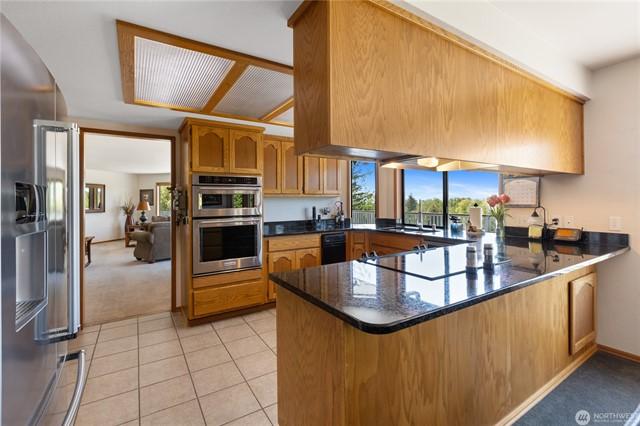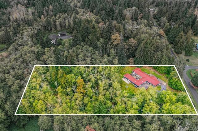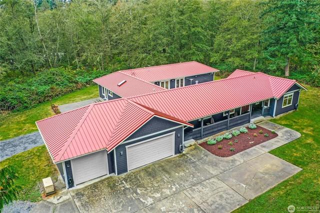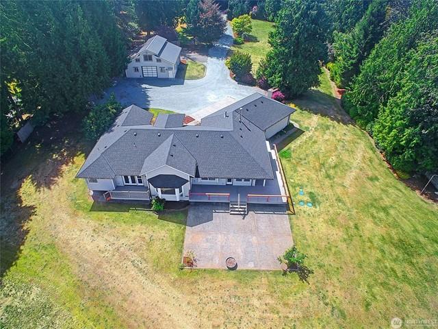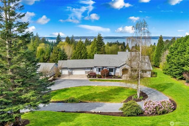 Entertainer & Golfers Paradise! Private 5-acre estate w/ 9-hole par-3 golf coursesand traps, pro signage & golf cart incl. Main home features wood floors, propane FP, kitchen w/ hickory cabs, tile counters, pantry & water view from sink. Custom bar off entry stuns w/ cherry cabs, granite, mosaic tile & martini-glass ceiling. Lofted primary suite offers 2 view decksPort Susan Bay sunsets & sunrises over courseplus spa bath w/ jetted tub, heated floors, skylights. Guest house, bsmnt suite, huge heated shop w/ 220, tall doors & enclosed wkshp. Outdoor bar behind garage, patios, gardens, fruit trees, Culligan water system & more!