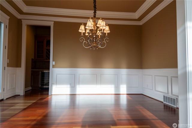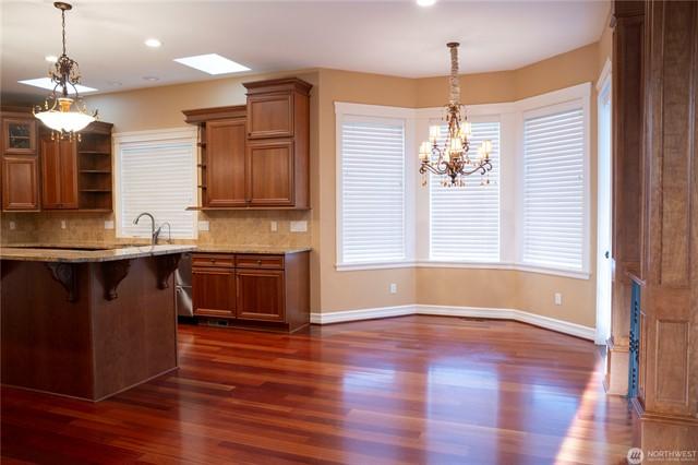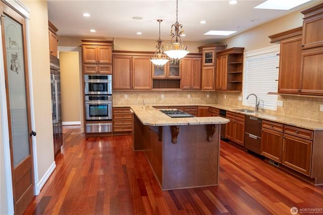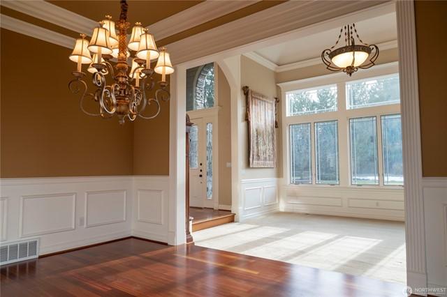 Meticulously built custom luxury home on 1.03 acres with partial mountain views in sought-after Snohomish. This architecturally refined residence offers 4 bedrooms, 3.5 baths, and over 4,300 sq ft of thoughtfully designed living space where craftsmanship and quality are evident throughout. Real cherry hardwood floors, matching cherry cabinetry, custom trim, and crown molding highlight timeless design and superior materials. The gourmet kitchen features slab granite countertops, oversized doors, a butlers pantry, and a large walk-in pantry, seamlessly connecting to expansive living and dining spaces with soaring ceilings and double-pane Pella windows.Designed for flexibility and function, the home includes a spacious rec room, bonus/play room, and dedicated home office. The primary suite is complemented by marble finishes on the upper level and spa-inspired baths. Exceptionally quiet construction with full interior and exterior insulation, including staircases, enhances privacy and comfort. Two air conditioning units, generator wiring, security cameras, and a water softener provide modern efficiency and peace of mind.Outdoor areas are utility-prepped for a future exterior kitchen with gas and water connections. The property includes a garden shed and comes with plans for a proposed 40x60 shop. An insulated 3-car garage, no HOA, and ample parking complete this rare custom offering, conveniently located minutes to downtown Snohomish, wineries, and commuter routes.