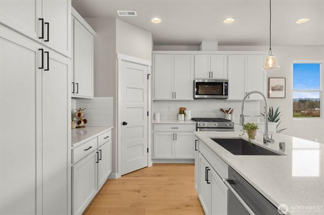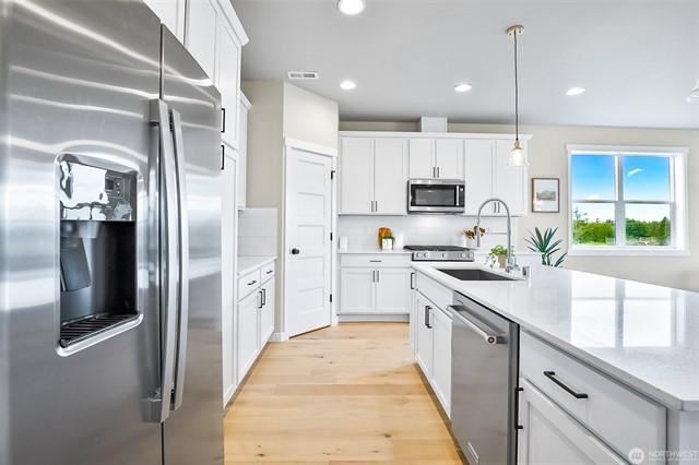 High-end finishes include 42 upper cabinets with lighted transoms, full-height quartz backsplash, BOSCH appliances, and an oversized island. The mudroom offers built-in bench cabinetry and leads to a fully finished 3-car garage. Come experience the quality and comfort firsthandyou wont be disappointed!
