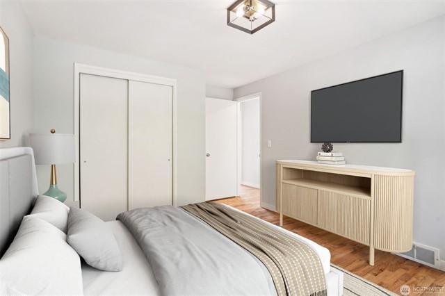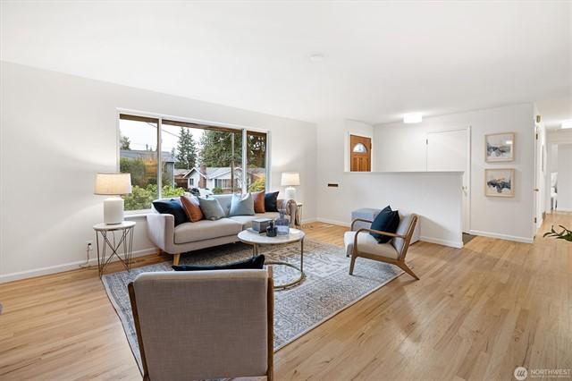 This Mid-Century Modern two-story is perfect for first-time buyers or investors. Built in 1959, this home boasts timeless character, featuring a stunning floating staircase and 3/4" thick Acacia hardwood floors throughout. Main floor living! Enjoy beautiful views of Ronald Bog from the 8,400 sqft fully fenced yard, ideal for outdoor activities and gardening + a 2-car garage with ample storage. Residents may opt-in to join the Meridian Park Swim Club community pool. This home is conveniently situated within walking distance of schools and parks. Commuting will be a breeze with the new light rail opening in late 2024! With some updates, this home is move-in ready, making it a great opportunity!
