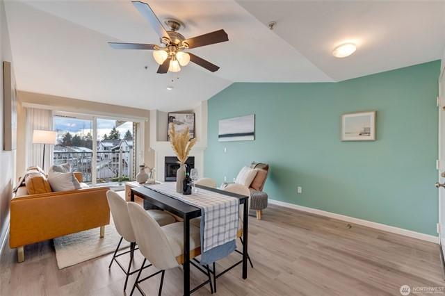 Great Location, Fantastic Price and Move-In Ready Condition! Top floor condo with vaulted ceilings, gas fireplace, in-unit washer/ dryer and HUGE private deck/balcony. The kitchen boasts granite countertops, updated cabinets and stainless appliances. Granite bartop opens out into your spacious and light filled living and dining room combo. Your primary suite offers ensuite bathroom, with tub and a luxurious sized walk-in closet. The second bedroom lives like a second primary suite. The balcony looks out over onto a beautiful woodsy greenspace, a bird-watcher paradise! Garage space plus one uncovered space. So close to Boeing, Freeways, & shopping. Strong HOA, newer roofs and new hardi-siding in entire complex. Come check it out!