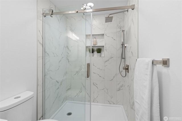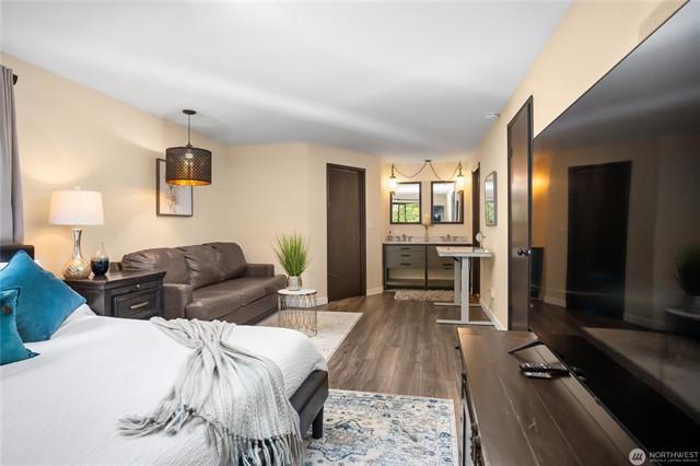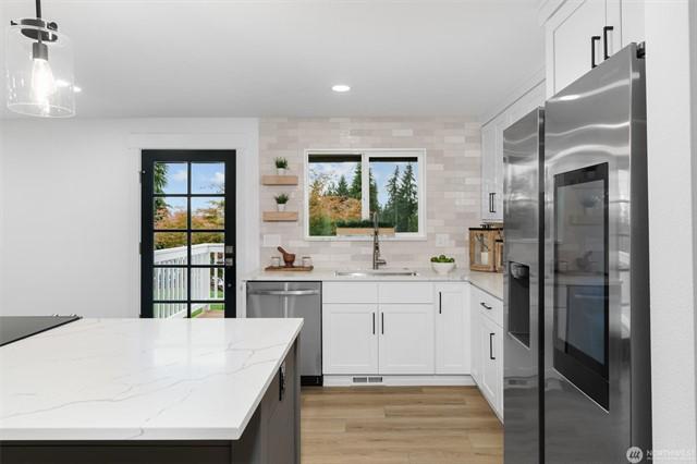 Charming 3-bedroom rambler on large level lot in the heart of Kenmore and sought after Northshore School District. Enjoy beautiful updates: granite countertops, custom maple cabinets, breakfast bar, SS appliances, and hardwoods throughout. Great open concept floor plan for functionality and entertainment. Primary bedroom boasts wood burning fireplace, private bath upgraded with Kohler walk-in shower, and walk-in closet. Love the surrounding windows for abundant natural sunlight with sliding glass doors onto oversized patio, fully fenced spacious backyard with shed. Ample parking space. Welcome Home!