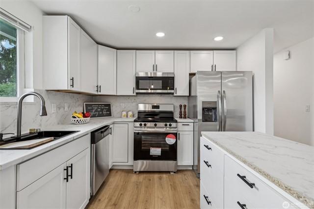 flooring, fresh premium interior and exterior paint, and a brand new roof. The beautifully updated kitchen is equipped with new cabinets, while both bathrooms feature modern tile work. Fresh landscaping enhances the curb appeal, and the home is conveniently located near shopping centers and major freeways. Combining modern elegance with everyday comfort, this home is truly a must-see