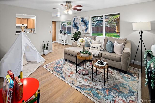 Discover your dream home w/this beautiful rambler on quiet cul-de-sac in Marysvilles coveted Quilceda Firs community. Quality-built & recently updated, this 3 bedroom home boasts a well laid-out floor plan from formal to casual spaces. Incredible natural light, from skylights & lrg windows, spotlights the beautiful NEW LVP flooring. Spacious LR & FR set the stage for both quiet evenings & entertaining guests. Lrg kitchen w/oak cabinets, SS appliances & pantry. Formal DR w/slider to lrg deck overlooking private sanctuary. Fenced backyard is an oasis for a peaceful afternoon, a day of play or gardening. Centrally located & minutes to schools, amenities, I-5. 2025: NEW Paint,/Flooring/Trim/Pest Inspection/Gas Line Inspection/Furnace Serviced.