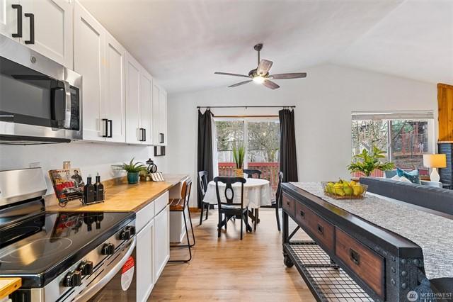 The kitchen features a spacious butcher block island, stainless steel appliances, smooth-surface cooktop, and elegant tile