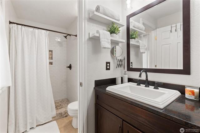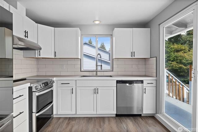 Get ready to fall in love with this home! As you enter, you're greeted by a cozy living room that flows effortlessly into a modern kitchen. Behind the kitchen, a spacious bonus room leads to your outdoor living space. A large deck and fully fenced backyard offer space for entertaining guests. The primary suite has a refreshed main bathroom & an attached sitting room. The main floor is rounded out with a bedroom & updated bathroom. Downstairs is perfect for guests/multigenerational living. The basement boasts a second kitchen, living room, two bedrooms, & a bathroom/laundry room combo with its own outside access. You will love the convenience of living just moments from I-5/ I-405, with plenty of shopping & dining options nearby.