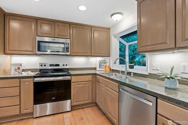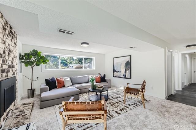 Spacious 4 bedroom, 2.75 bath home is conveniently located in a quiet neighborhood at the end of a cul-de-sac. Light-filled kitchen with eating area & stainless appliances flows into the inviting living room, featuring a brick fireplace. Primary suite on the main includes a full bath & plenty of closet space. Finished lower level boasts a rec room w/ fireplace, 2nd kitchen, .75 bath, office/flex space, laundry room & bedroom. Entertainment sized deck leads to the fenced back yard, complete with sports courtperfect for pickleball!! Amenities include double/pane windows, attached 2 car garage, updated electrical panel, newer comp roof. Close to schools, shopping, Lynnwood pool & library, bus, new light rail. Dont miss this exceptional home!