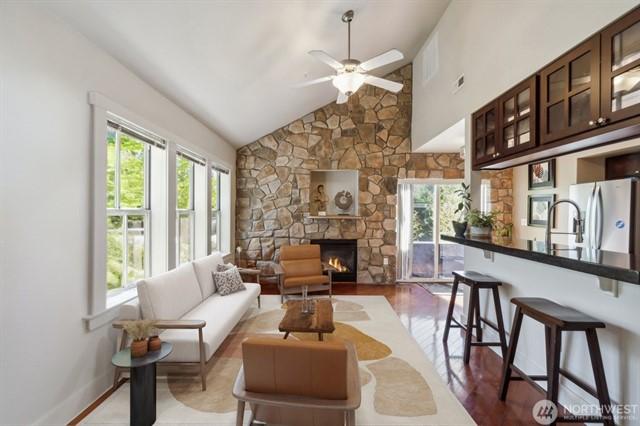 Discover contemporary living in this captivating 2-story 2 bedroom, 2 bathroom townhome. The inviting open-concept main space boasts a striking rock fireplace, eat-in kitchen with bar seating and seamless flow to the patio, perfect for gatherings.