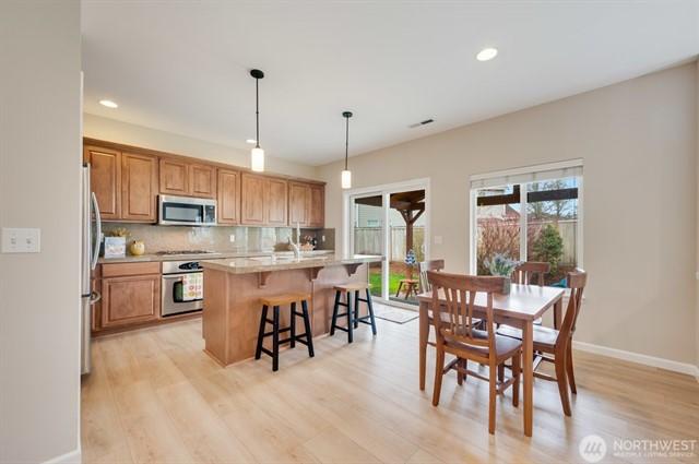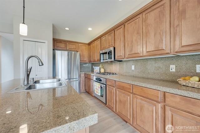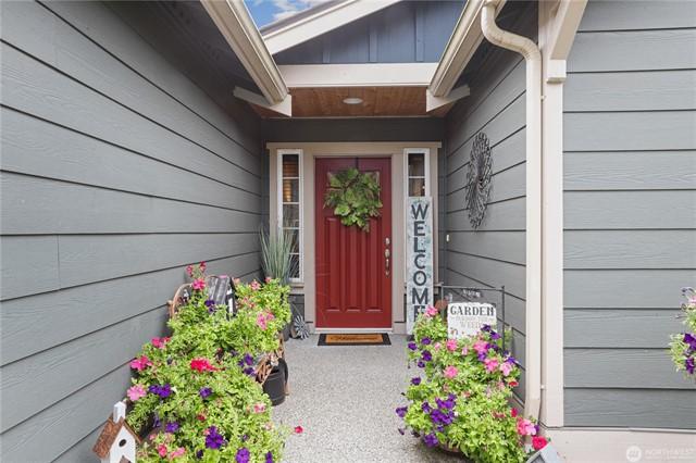 This stunning corner lot rambler is the one! Upon entry, you'll love the expansive walkways, vaulted ceilings and loads of natural light. The open concept kitchen features granite counter tops, SS appliances + bar top, so you can entertain while you cook. Savor your morning coffee with Cascade mountain views on expansive trex deck that spans the length of the home! You'll also appreciate the 2023 heat pump with central A/C year round. 2021 sprinkler system in front and back yard, plus gutter strip to keep your yard looking great. Primary suite w/ French doors, huge walk in closet and ensuite bath. Enjoy the luxury of the 3 car garage + large driveway. Lovely neighborhood w/ walking trail + community park-don't let this one get away!