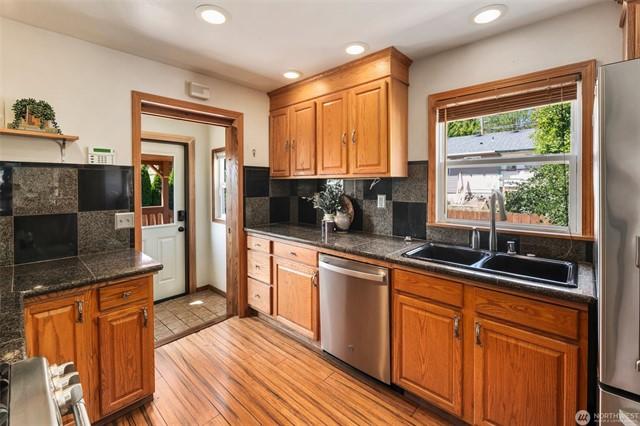 Fully updated Dutch Colonial Farmhouse in an incredible location with a large 5,120 sf lot. Character & charm of 1902 but fully updated with new wiring, plumbing, central AC & Heat, double pane windows & more. Main floor features a welcoming sun/ mudroom entry, fir floors, elegant millwork, built-ins, updated kitchen with butcher block counters, stainless steel appliances & farm sink, 1/2 bath on the main & access to the back deck. Upstairs is the primary suite with private bath & walk-in closet + two additional bedrooms & full bath. Finished basement with rec room, 4th bedroom, utility area & separate entrance. Large backyard is a gardeners delight with mature plantings of all varieties, patio & multiple sheds. Driveway parking for 2 cars.