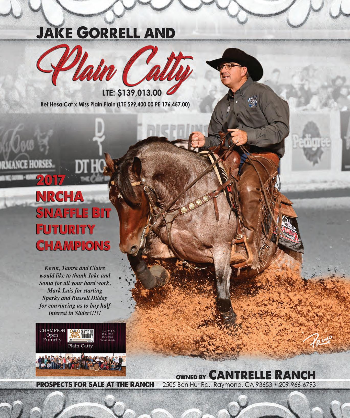 The 2017 NRCHA Snaffle Bit Futurity Open Champion Plain Catty ridden by Jake Gorrell for owner Kevin Cantrelle.