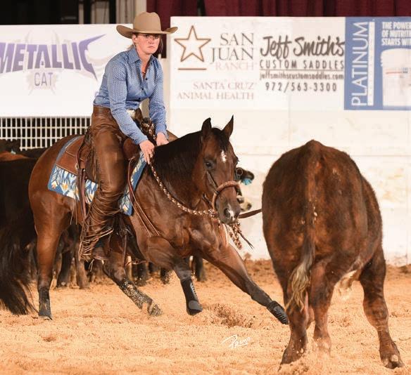 Open Snaffle Bit Futurity Champion Sarah Dawson worked her given cow on winner Selvarey, but prior to that run, accepted a new cow on mount Smart Chic An Tari.