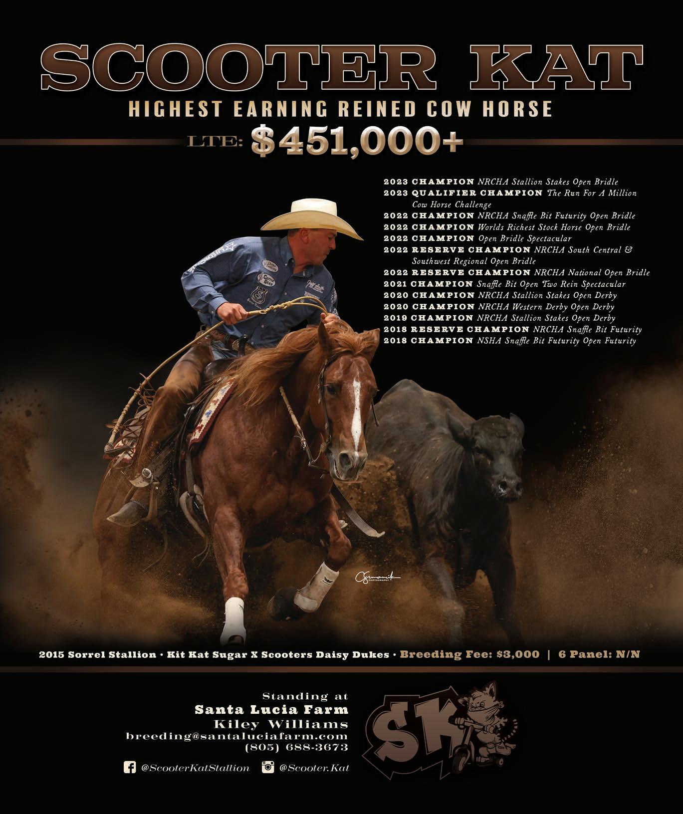 SJR CATLIKE MIST 2022 sorrel stallion (SJR Diamond Mist x Catlike Kit, by High Brow Cat). Dam LTE $164,994. Dam PE $43,960.