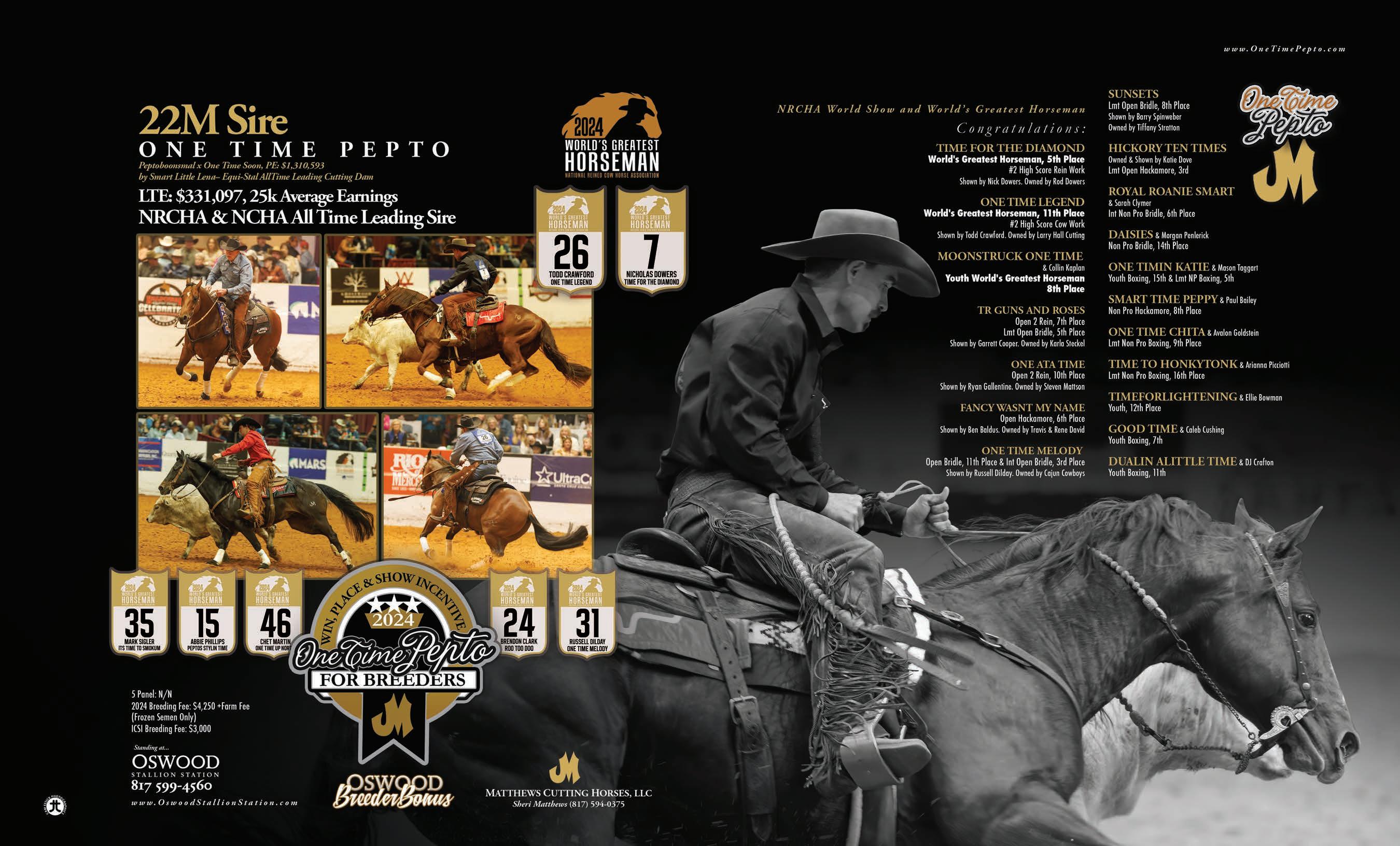 One Time Pepto continues his legacy in the reined cow horse industry by becoming the newest five-million-dollar sire. The late stallion, owned by Mathews Cutting Horses, secured over $50,000 in offspring earnings during the event.