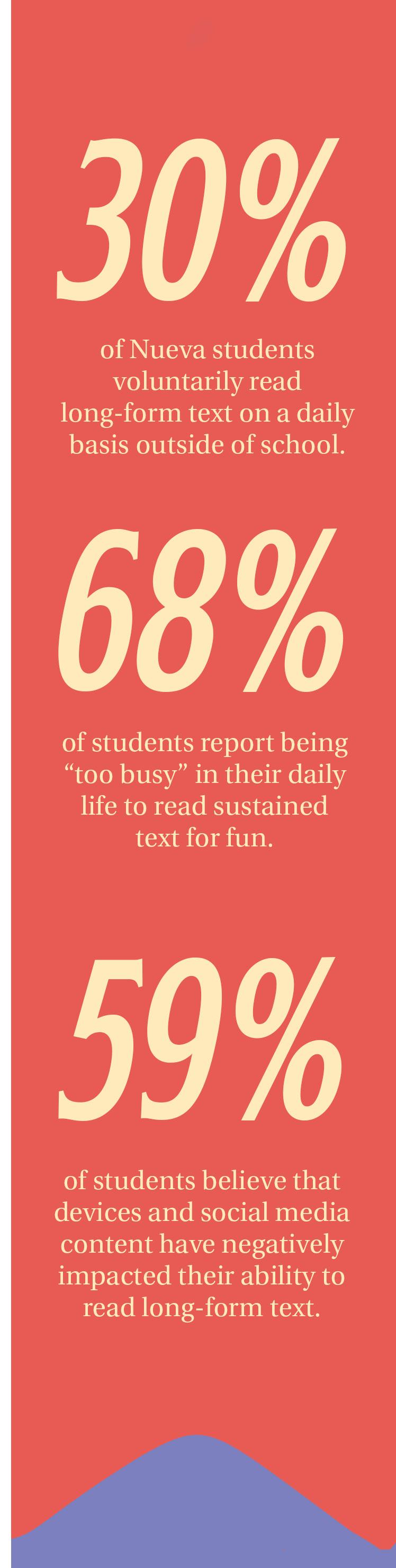For many Nueva students, pleasure reading has been slowly crowded out by increasingly full schedules: 68.4% of respondents reported being “too busy” in their day-to-day lives to read sustained text for fun.
