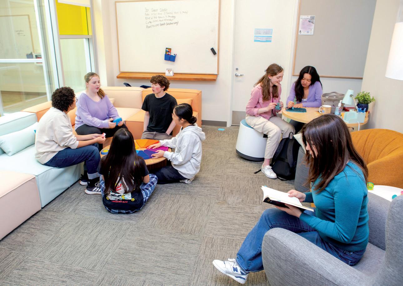 Enhancing the visibility and accessibility of humanities classes was a major goal of the project. The expanded building is now the “hub” of Nueva’s Hillsborough campus, Lee explained, with “spokes” reaching out the I-Lab, the café, the Science and Environmental Center, athletics, and the arts. (Read about the anticipated new Hillsborough arts center in the sidebar at right.)