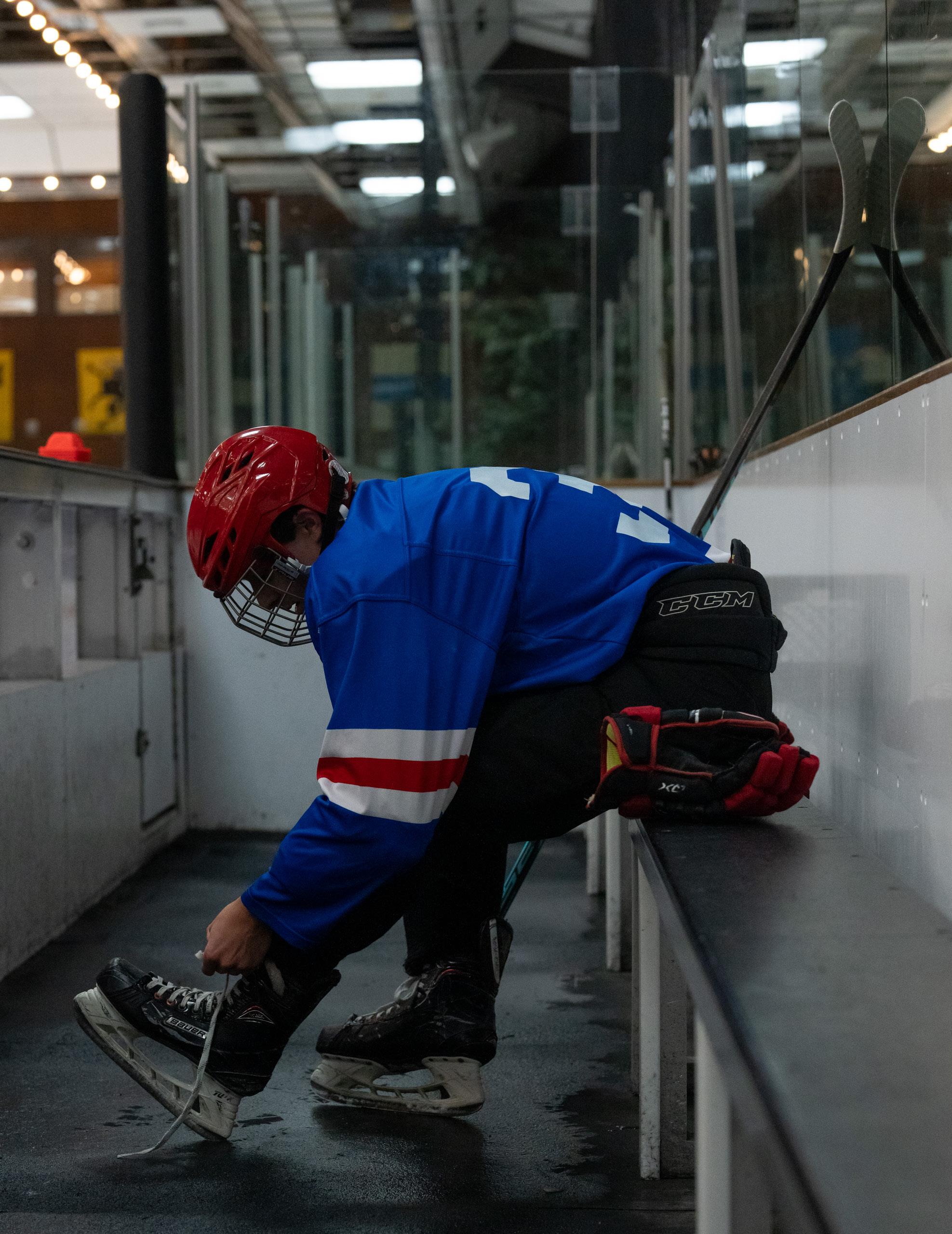 Koop follows a specific order to put on his gear — jock, kneepads, pads, socks, pants, skates, tape the socks, shoulder pads, jersey, helmet, then gloves. This repetition keeps him grounded and ensures nothing is overlooked.