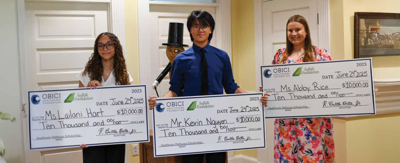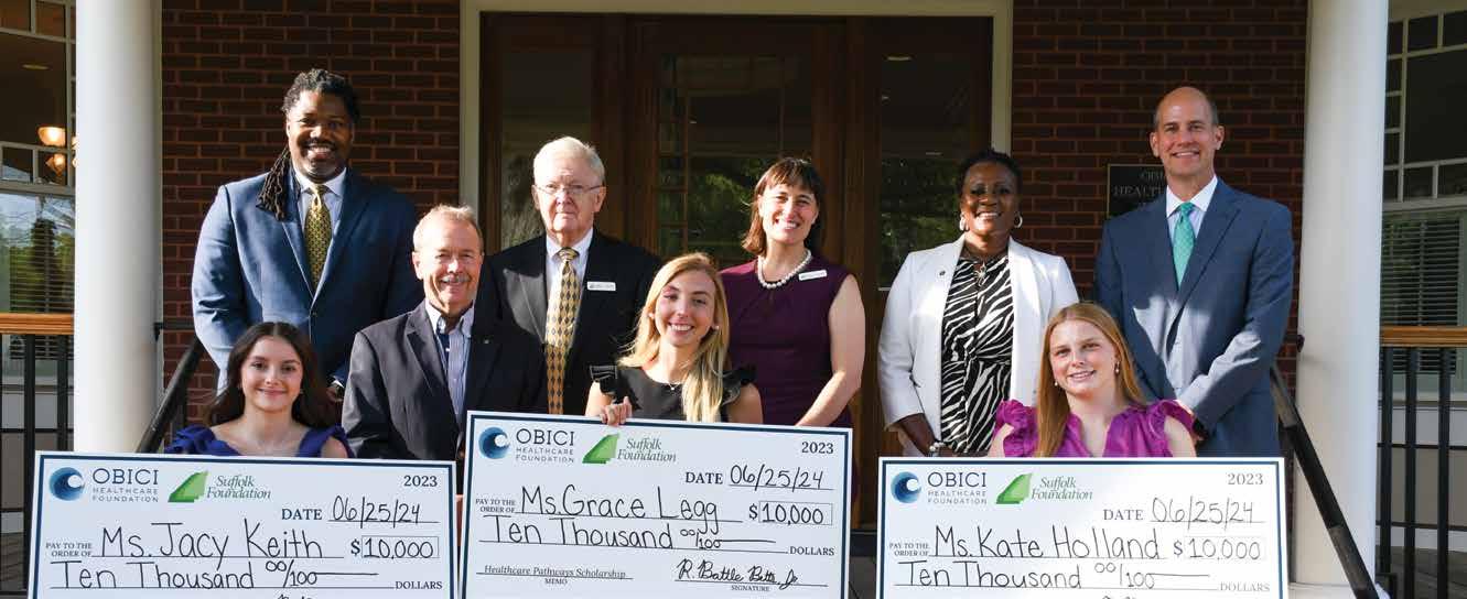 Pictured front row left to right: Jacy Keith, Taylor Grace Legg, and Kate Holland. Pictured, back row left to right: Kelvin Turner II (OHF Program Officer); Dr. Ralph L. Howell Jr., DDS (2024–2025 OHF Board Chair); Kermit Hobbs Jr. (The Suffolk Foundation President); Lorelei Costa Morrow (The Suffolk Foundation Executive Director); Melissa D. Rollins (2025-2026 OHF Board Vice Chair); and R. Battle Betts, Jr. (OHF President & CEO).