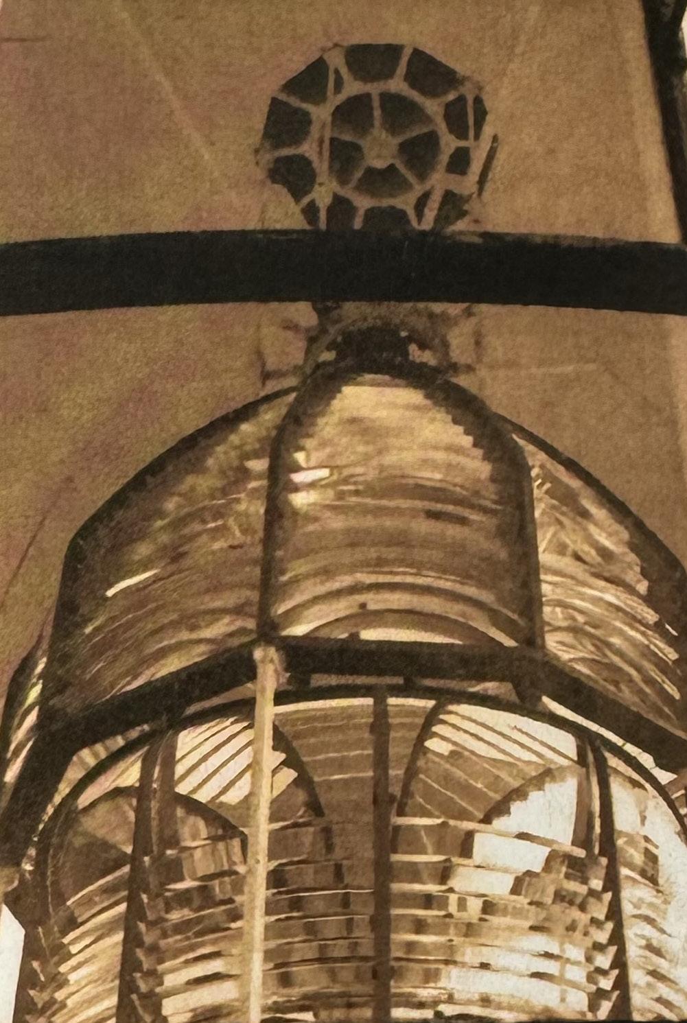 With the foundation in place, work began on the brick tower, which slowly grew to a height of roughly 100 feet. Atop the tower, a decagonal lantern room was installed to house a third-order Fresnel lens, manufactured by Sautter & Co. of Paris, France. This lens was different than most in that its lower and center sections were fixed, while its upper section, made up of ten bull’s-eye panels, revolved once in five minutes to produce a flash every thirty seconds. Brackets supporting the upper section of the lens were connected to a pedestal that revolved atop chariot wheels. Every eleven hours, the keepers had to wind up a ninety-pound weight that was suspended between the tower’s inner and outer walls and powered the revolving mechanism.