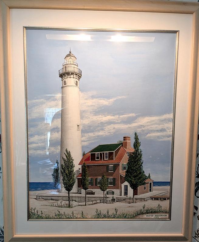 Dave is also an artist, a skill he says he got from his grandmother that paired nicely with his background in architecture. He used that skill years ago to paint a beautiful image of the Little Sable Point lighthouse as it appeared during its heyday, when it was painted all white (the Coast Guard stripped the paint in the 1970s). He also included the old residence next to the lighthouse in the painting, using a black-and-white photograph and what he knew of the old house to paint it the correct color. Dietrich said he used a magnifying glass while doing the painting, and the care he used shows in the final product, which is on display in the home he shares with Mary Jo, along with a few other works of his.