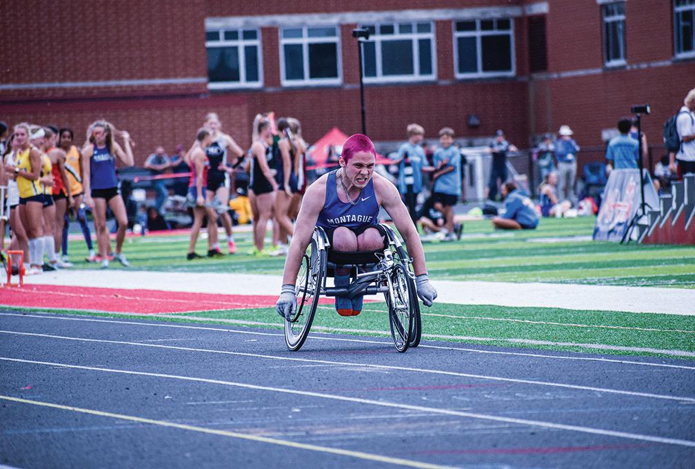 Montague’s Wyatt Fairchild races to the finish line in the 400-meter adaptive event at the Division 3 state track meet in Kent City June 1. Fairchild is Montague’s first-ever adaptive track athlete. • Brendan Samuels/Mirror