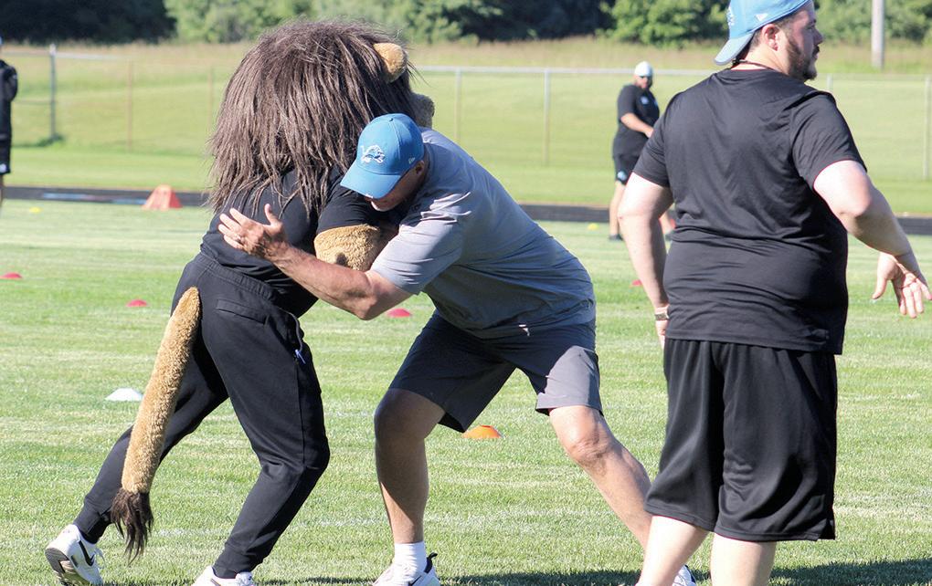 Former Detroit Lions guard Tony Semple (center) gets pumped up for the Lions’ youth camp in Montague Monday with mascot Roary. Semple played 10 seasons for the Lions, from 1994-2003, and was a guest coach at the camp.